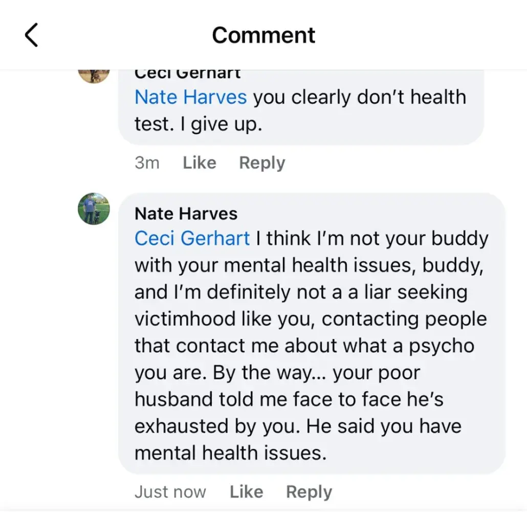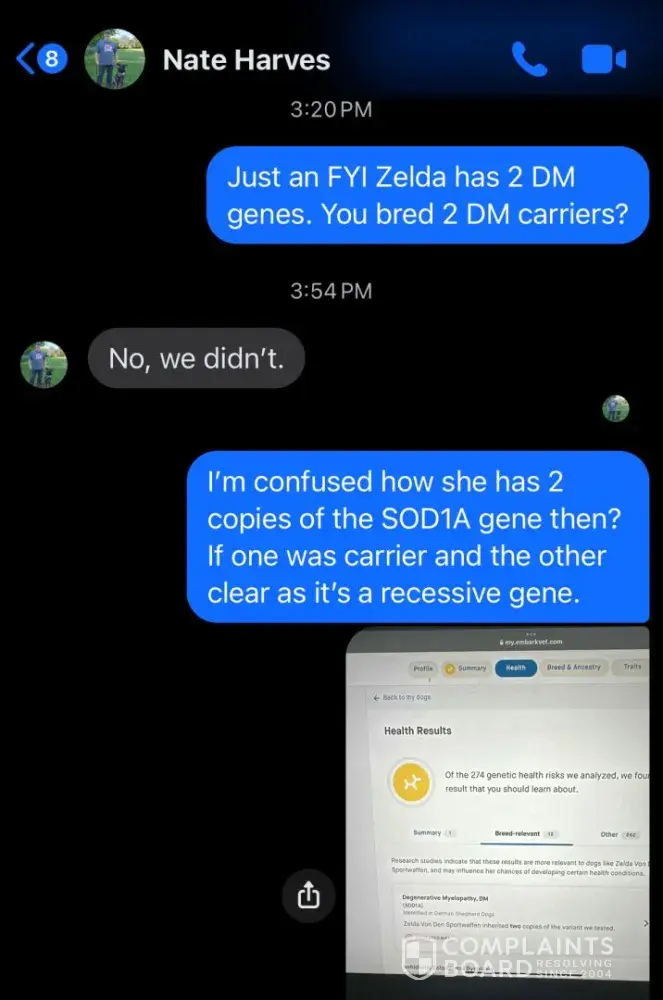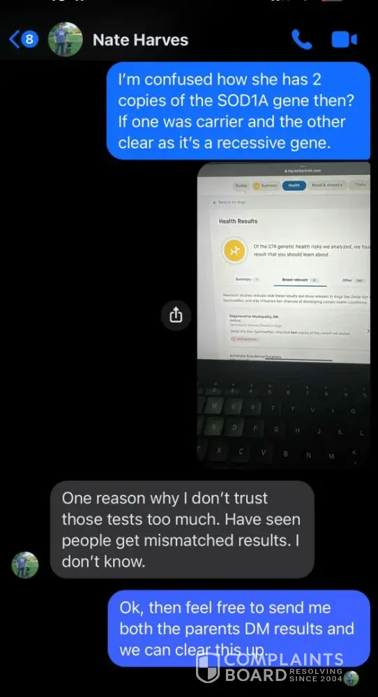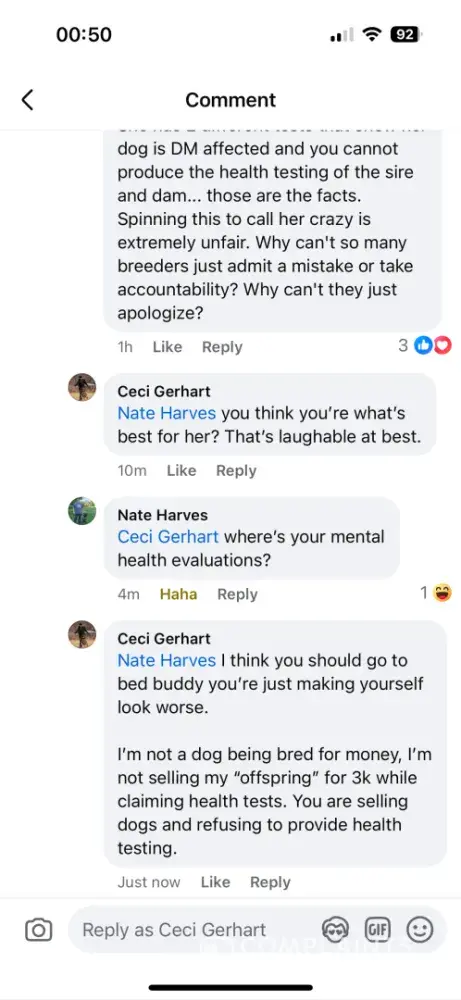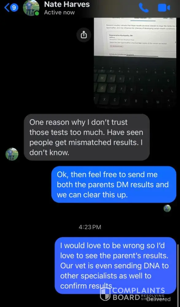 As per the pictures posted Nate is a bully. He bred 2 DM carrying dogs and produced a DM affected female. But refuses to provide any proof of health testing while continuously calling me insane and a liar.