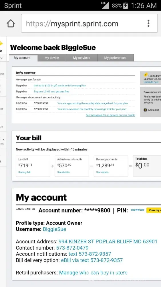 The reason we are not sure what our bill is now is because Sprint changed their website 3 weeks ago and we have not been allowed access to our account for the past three weeks. I have called customer service 3 times for help logging on, after trying to re-register myself about 7 times. I was unsuccessful and so were they. They apologized at customer service and said try back in a few days. I asked for a statement to be mailed to me because I receive no bill other than online but they have not done this and it has been a week since I asked.