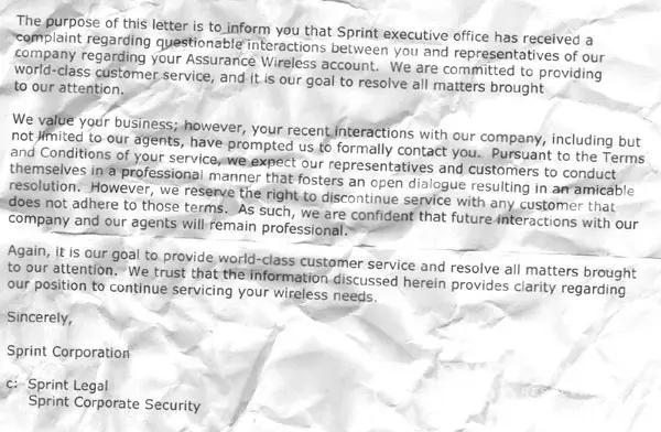 So my understanding is that if you make the mistake of arguing with faulty customer service from Sprint and anyone who is associated with you will get a letter with passive aggressive writing shaking a finger at you and punishing your reactions to their jerkwad way of doing things? I will say this much. I am glad not being a direct customer of Sprint because I would hate to see just how I would be treated if I were after all this nonsense.