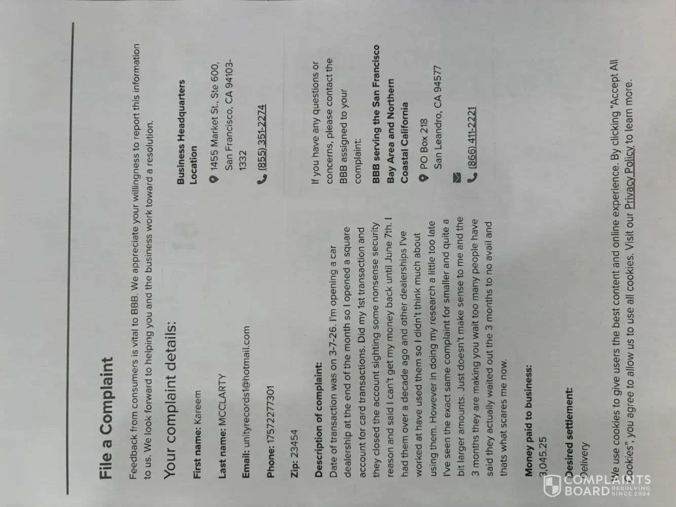 The California Department of Businesss Oversite is one place you can go to file a complaint. They have a website where you can file a complaint online. The FTC is another place you can go to file a complaint. They have a phone number you can call or a complaint form you can fill out online. The California Attorney General is also a place you can go to file a complaint. They have a website where you can file a complaint online. If you are disabled and need to file a complaint, you can go to the ADA website and find out how to file a complaint. Finally, if you want to file a complaint with the BBB, you can go to their website and file a complaint.