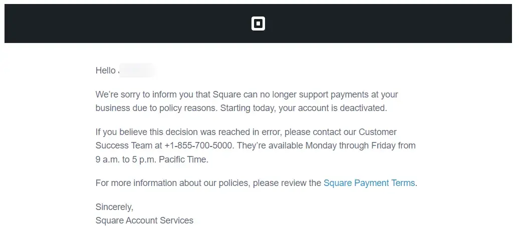 On May 10, 2022, I got an email stating that my account with Square was deactivated.