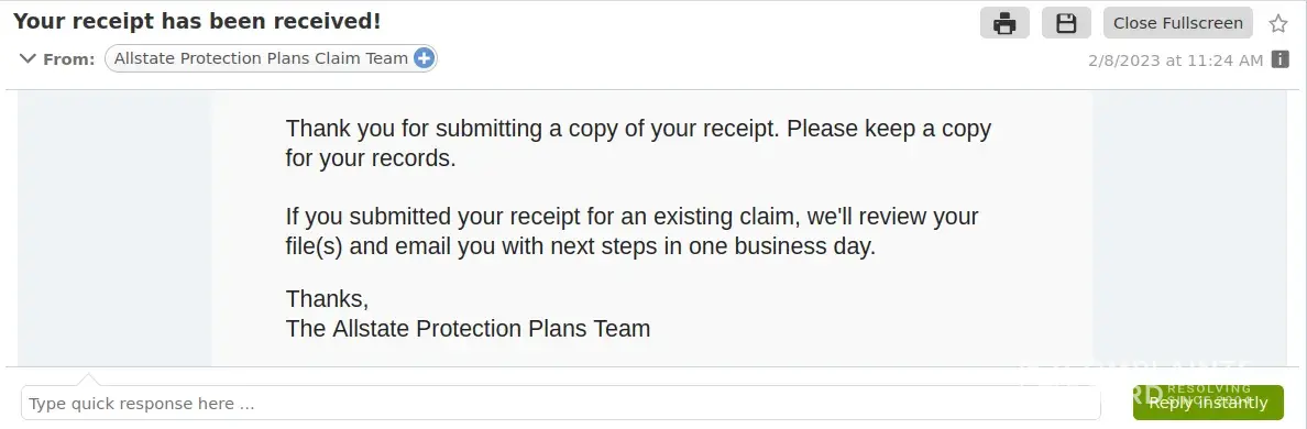 So, I decided to file a claim with SquareTrade-Allstate. Once again, I had to submit a lot of data, which I did the same day. A representative informed me that they needed 2 hours to make a decision. I followed up with them on February 20th, only to find out that they had lost the email I submitted. I had to explain to them again that online purchases do not have receipts and that I had provided a scan of my credit card statement instead.