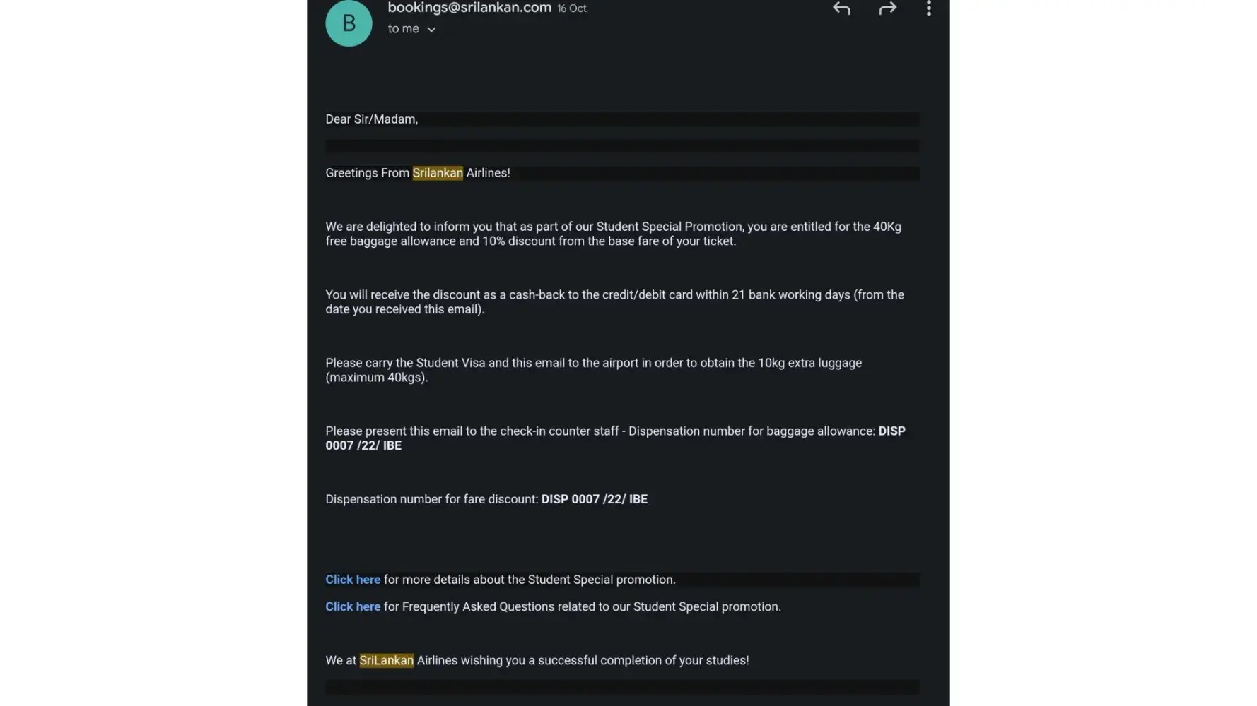 I was waiting for the confirmation of my baggage allowance that I requested through student special and student cash back discount. And contacted Sri Lankan airlines many times and I was being told that will receive the confirmation within today but unfortunately I didn't receive it yet. I am so disappointed on your service and awaiting forward your earliest response. Please do the needful as earliest.
