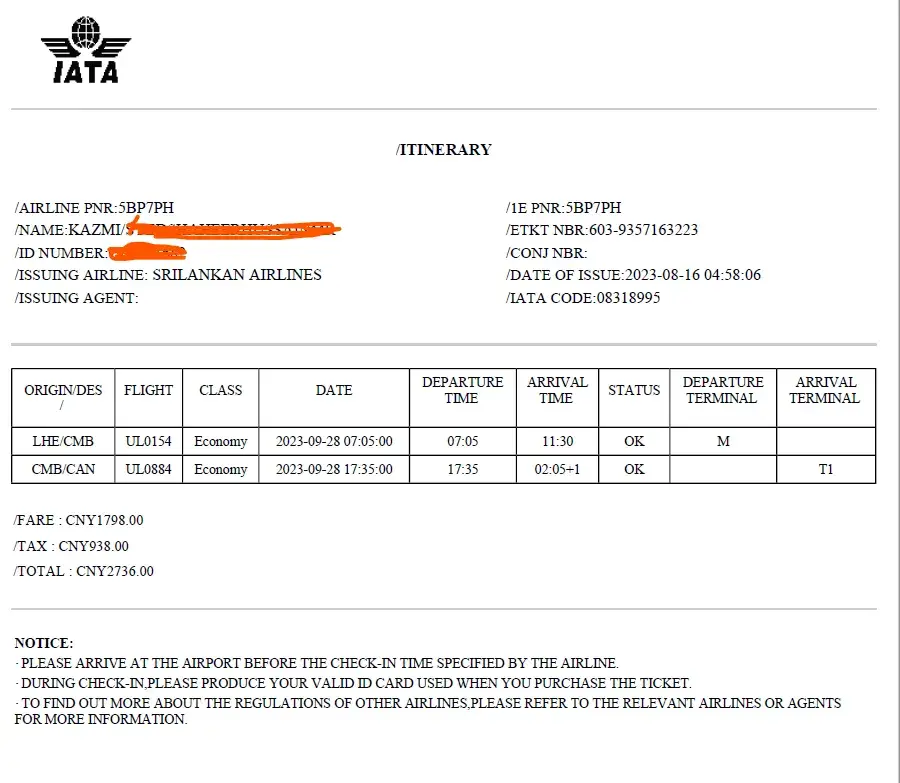 Ticket number is 603-[protected]. (Flight Cancelled on 28/09/2023 from Lahore to Colombo and Colombo to Guangzhou, China.