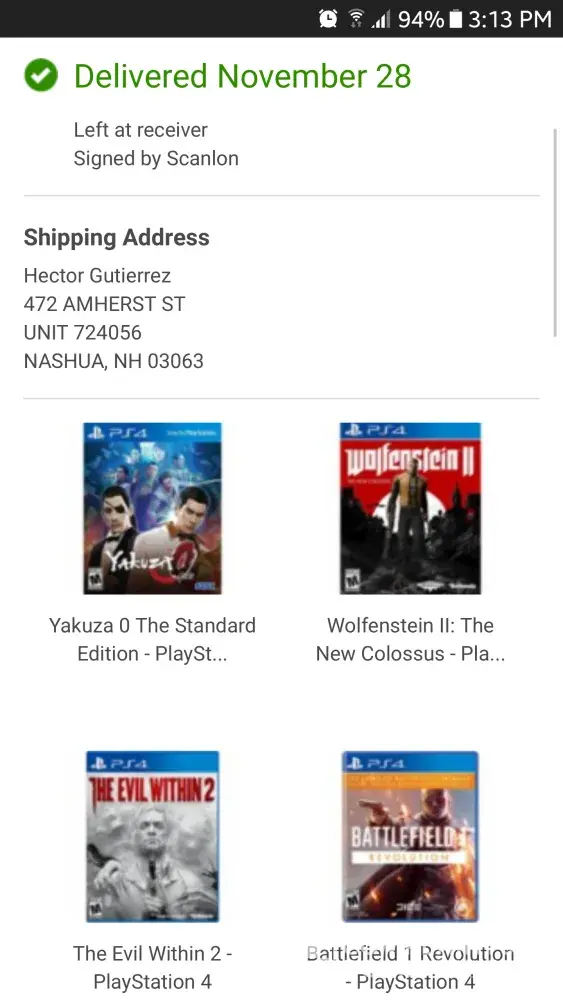 The items are: Battlefield 1 Revolution Edition, Wolfenstein 2, The Evil Within 2 and Yakuza 0. All 4 items are playstaion 4 games and were New.