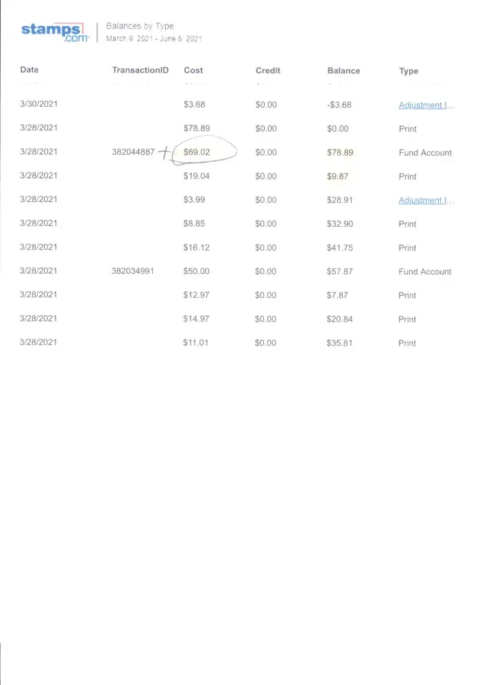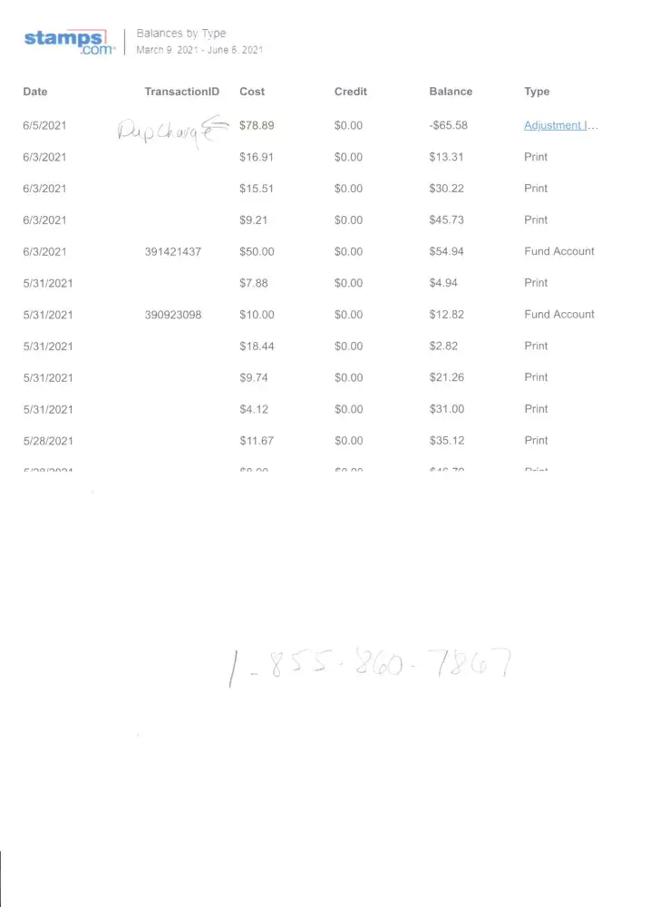 On March 28 I shipped 3 packages to same address for a total of 78.89 charge. I had a balance of 9.87 in my stamps account and funded the remaining of $69.02 from my bank which cleared my bank on 3/31/21. On 6/5/21 an adjustment was made for $78.89 again leaving my stand account with a negative balance! This is absolutely ridiculous that these charges would be duplicated... This is not the first time such incidents has happened.