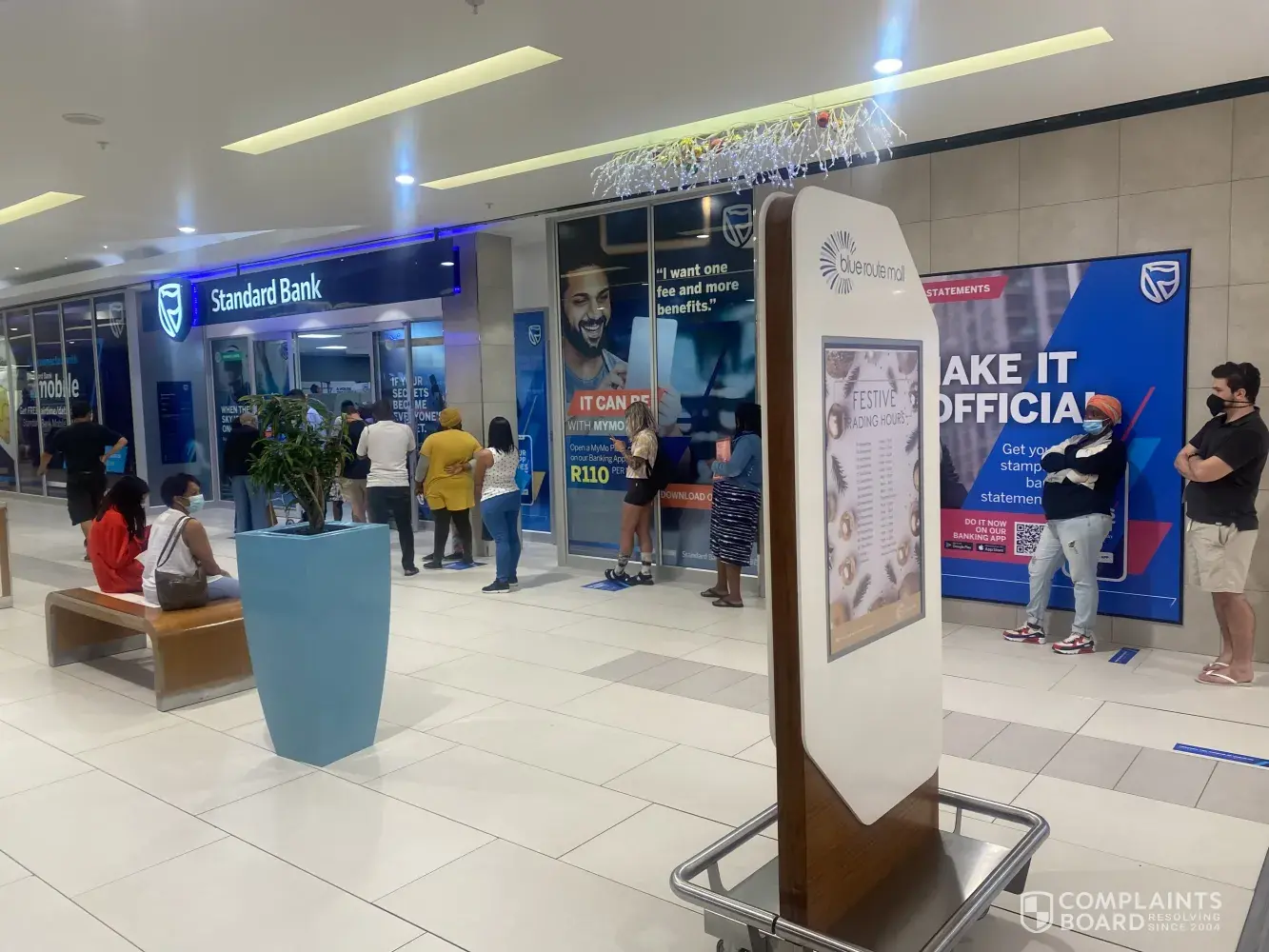 The 29th of December, queuing for more than an hour, queue running outside standardbank, Fish hoek branch closed down had to drive to Blue Route Mall!