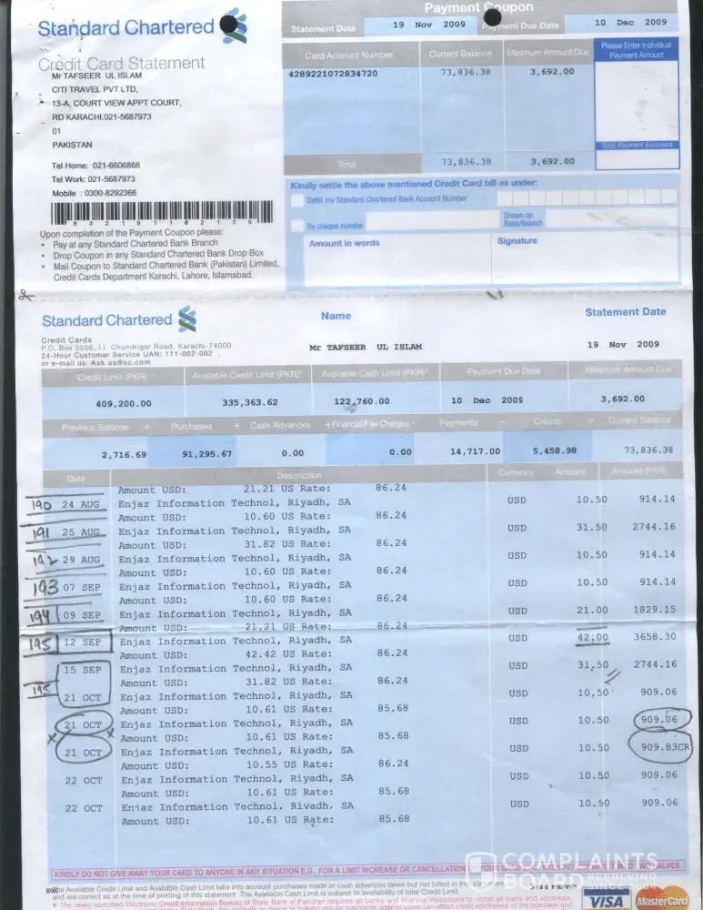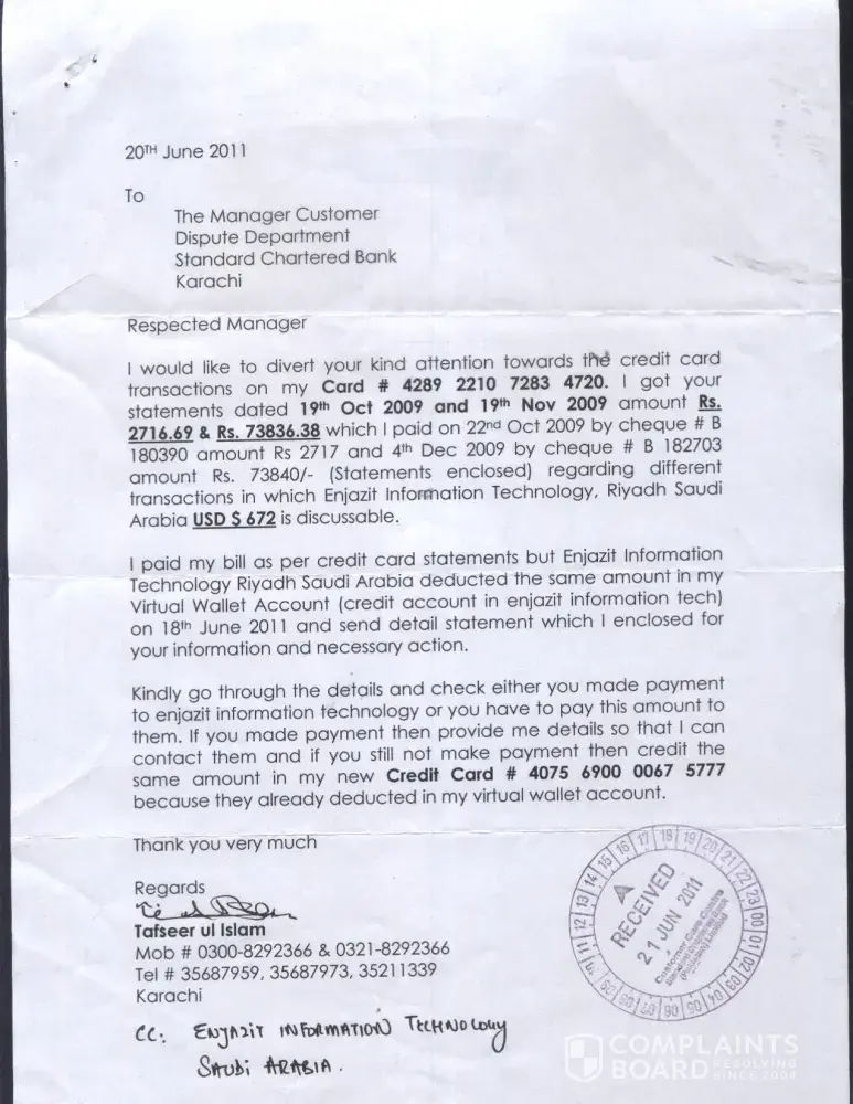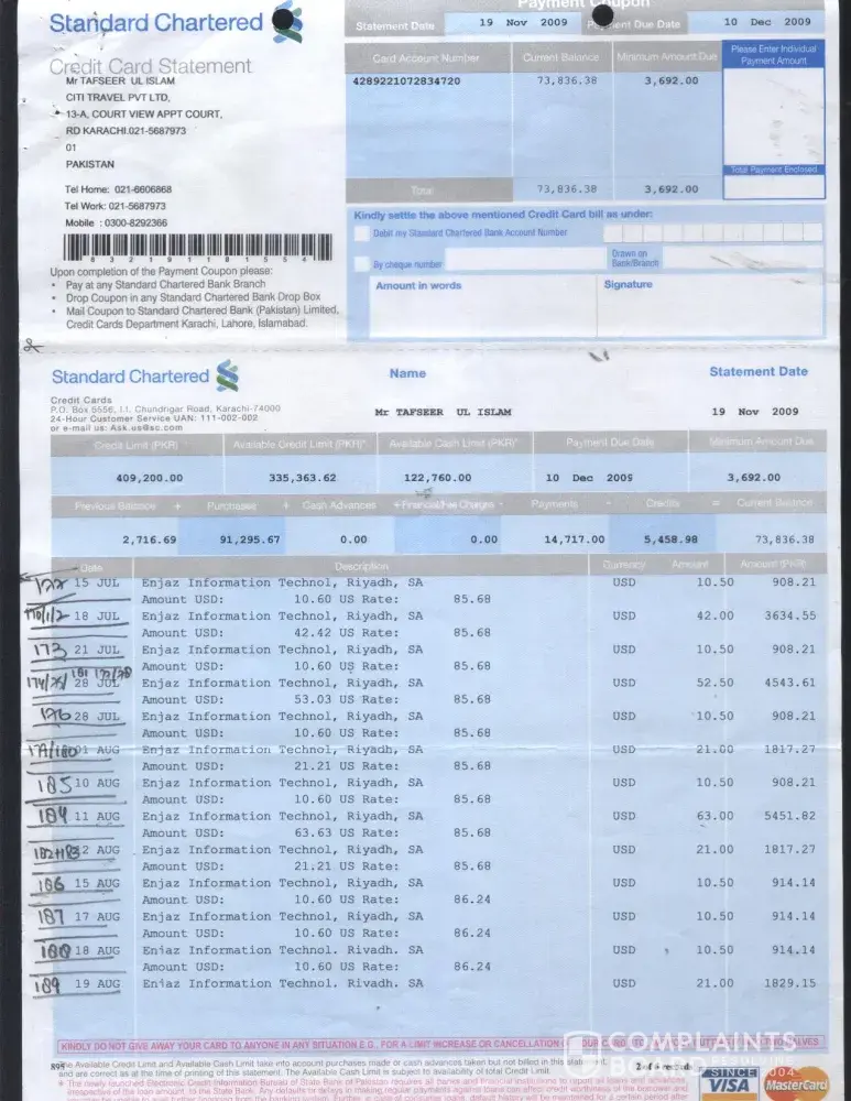 I would like to divert your kind attention towards the credit card transactions on my Card # [protected]. I got statements dated 19th Oct 2009 and 19th Nov 2009 amount Rs. 2716.69 & Rs. 73836.38 which I paid on 22nd Oct 2009 by cheque # B 180390 amount Rs 2717 and 4th Dec 2009 by cheque # B 182703 amount Rs. 73840/- (Statements enclosed) regarding different transactions in which Enjazit Information Technology, Riyadh Saudi Arabia USD $ 672 is discussable.