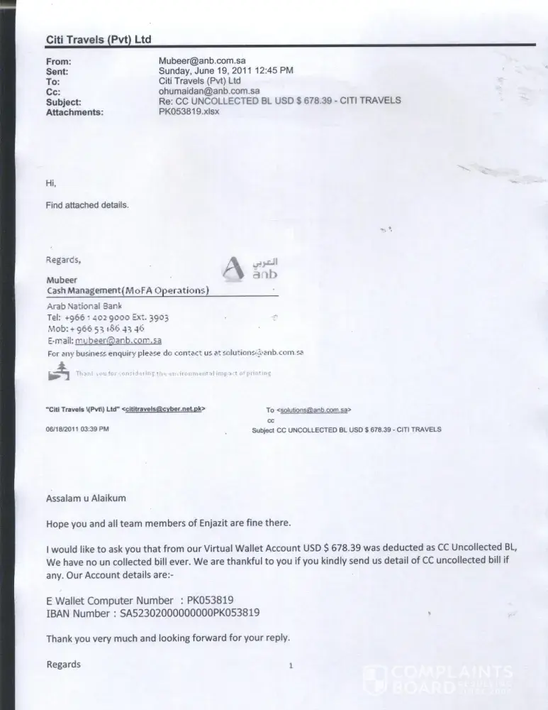 I paid my bill as per credit card statements but Enjazit Information Technology Riyadh Saudi Arabia deducted the same amount in my Virtual Wallet Account (credit account in enjazit information tech) on 18th June 2011 and send detail statement which I enclosed for your information and necessary action.