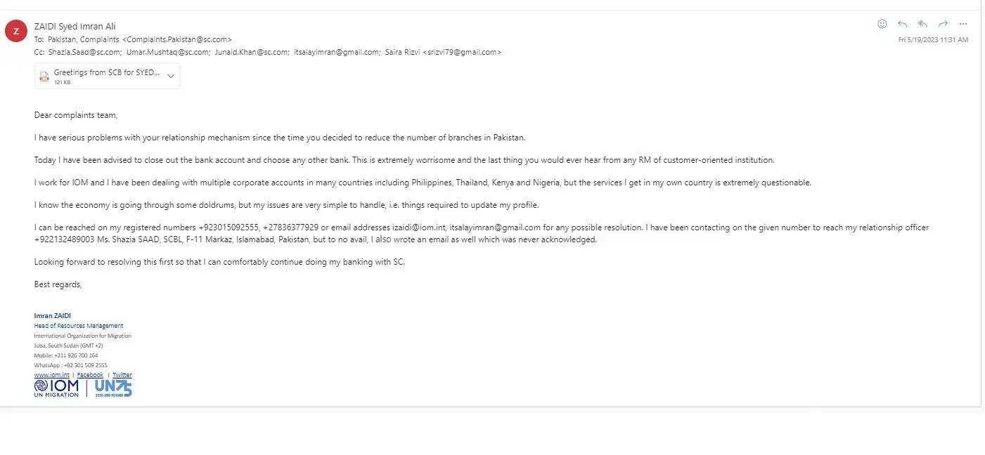 Serious problems with relationship mechanism. Today I have been advised to close out the bank account and choose any other bank. This is extremely worrisome and the last thing you would ever hear from any RM of customer-oriented institution. I can be reached on given contacts +[protected], +[protected]; izaidi@iom.int, itsalayimran@gmail.com.