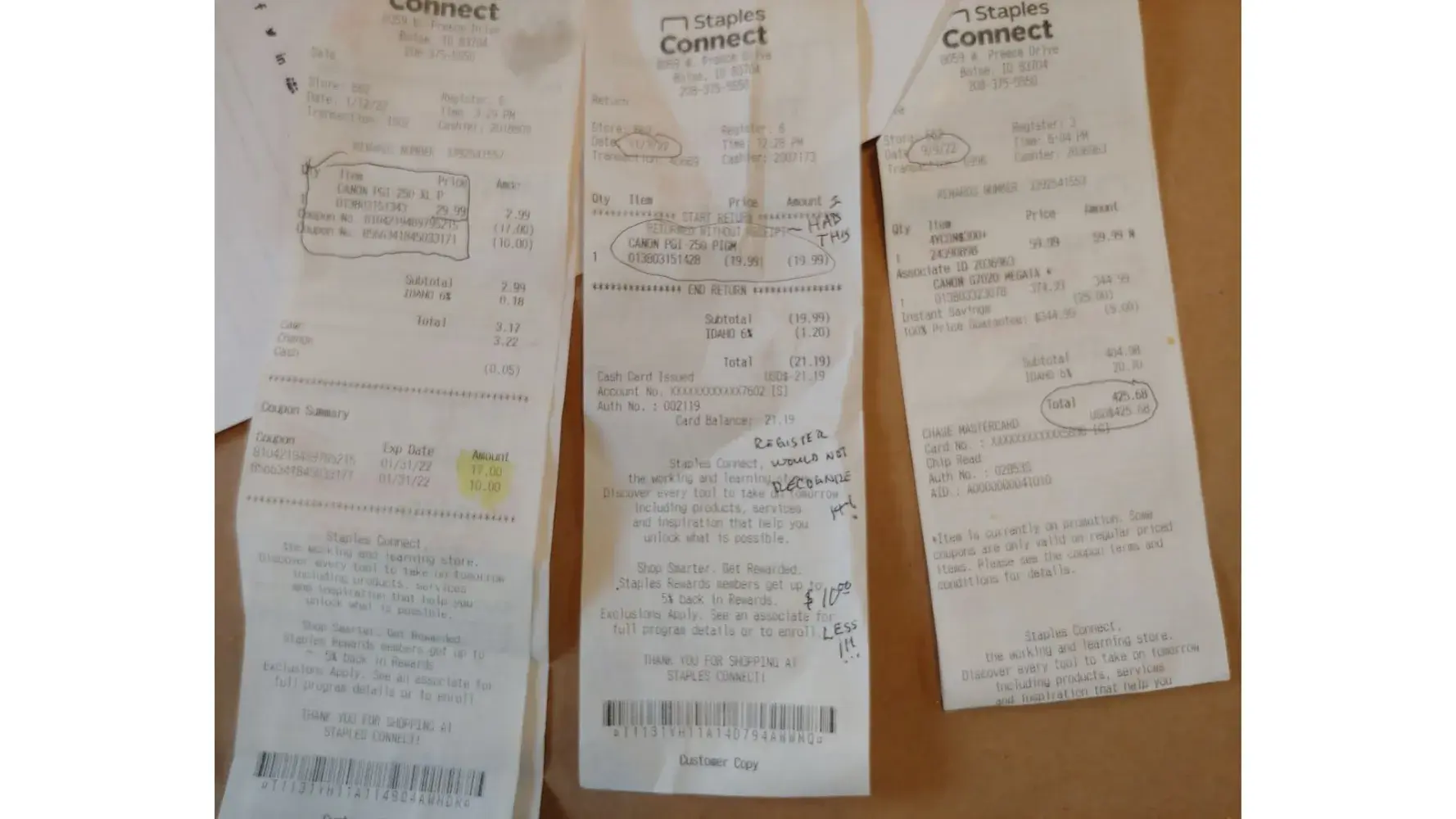 On 9/9/22 went to Boise, ID.-Preece Dr location & purchased a new Canon G7020 printer for $425.00. As part of that pmt. I expected to receive full credit for Canon ink cartridge purchased 1/22/22 that was new, sealed & had NO EXP. date. Because store mgr. Mark could not get register to recognize bar code on cartridge receipt all I got was the lowest price the cartridge had sold for in the last year. That amt. was $19.99 versus my orig. receipt price of $29.99! So I was shorted $10.00 & undoubtedly Staples put that cartridge back on the shelf for sale again since it had NO EXPIRATION DATE and garnered, yet again, add'l. profit of the same item. I'm out $10 +.60 tax and Staples gets add'l. profit. Not Fair! Staples return police for ink cartridges is "Ink & Toner: Unopened, unexpired items may be returned at any time. Opened or expired items cannot be refunded." as shown on their website. Mark stated that was the best he could do. I strongly think that Staples needs to do MUCH better, especially taking into account I was there making a $425 purchase. You're shorting me $10 because YOUR register cannot read one of YOUR printed receipts? My opinion is that is not a customer problem, right?