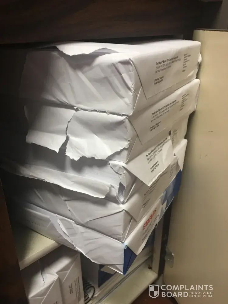 I received the two cases of paper that I ordered today (6/21/18) and every single pack of paper, including the boxes, were torn open. The packs of paper were still inside the boxes, but it looked like they had been very mishandled. The paper is still usable; however, the outside packaging is shredded and will have to be stored a certain way to ensure that the paper is still usable. My order number is 9788170459. I would like for this issue to be addressed. Since the paper is still usable, I don't think a return will be necessary, but I would like to know if I could get some form of discount for the next time I shop with Staples. Thank you! For any further contacting, my direct email address is [protected]@medtecllc.com.