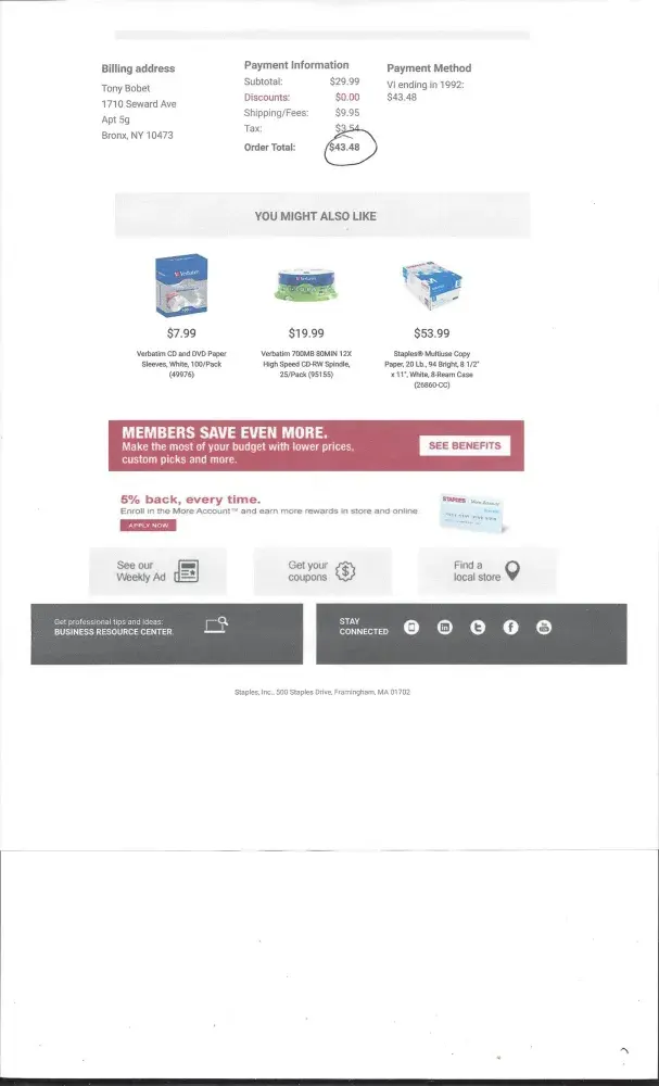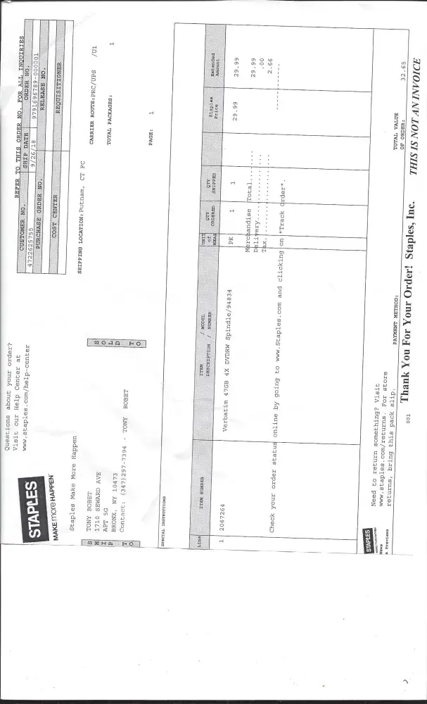 My name is Tony Bobet. I resided at 1710 Seward Avenue. Bronx, New York City, 10473, Apartment #5-G. I order an item name is Verbatim 47 GB DVD-RW for the amount of $29.99. When I received the item. And, I saw the receipt. Is much different then the one.in the below of this page its will show of what I am talking about. I am not scam or fraud of the amount.