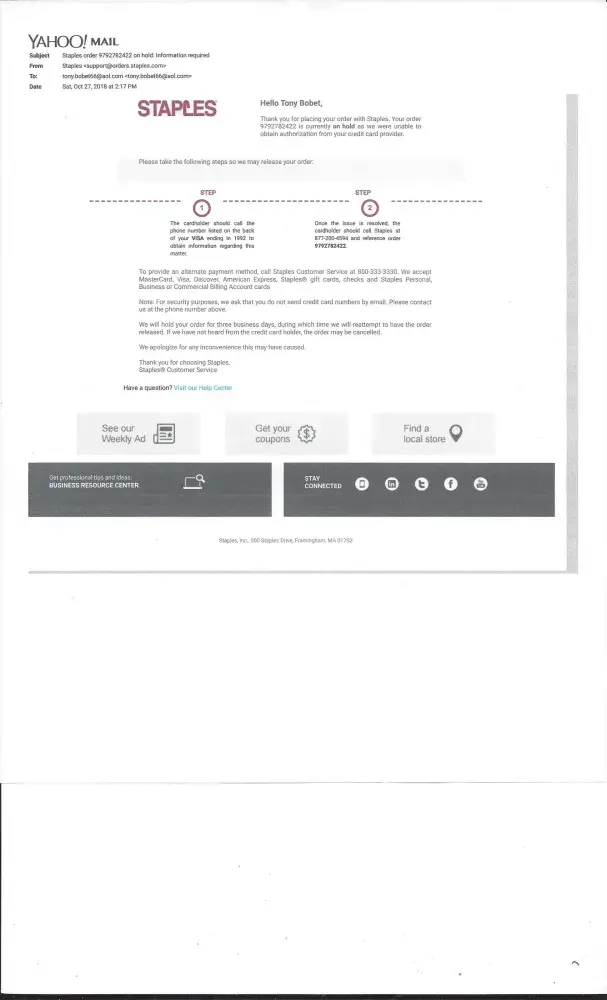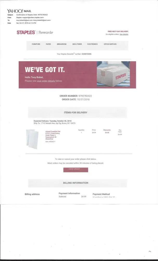 My name is Tony Bobet From New York City. I am filing an complaint to Staples.com. I was planning to order an item on October 27, 2018. The item that i order Ampad Quadrillie Pad 8 1/2 x 11 Quad Ruling Graph Paper 4 squares inches 50 sheet Pad. the amount of the item of $4.99. Order# [protected]. I pay with Courtesy Coupon from the amount of $20.00. When i ask for the assist. from Kenneth. He was the one was helping. He was lying to me. The Courtesy Coupon #[protected]. And, its Expiration on 02/28/2019. I want to an gift certificate.