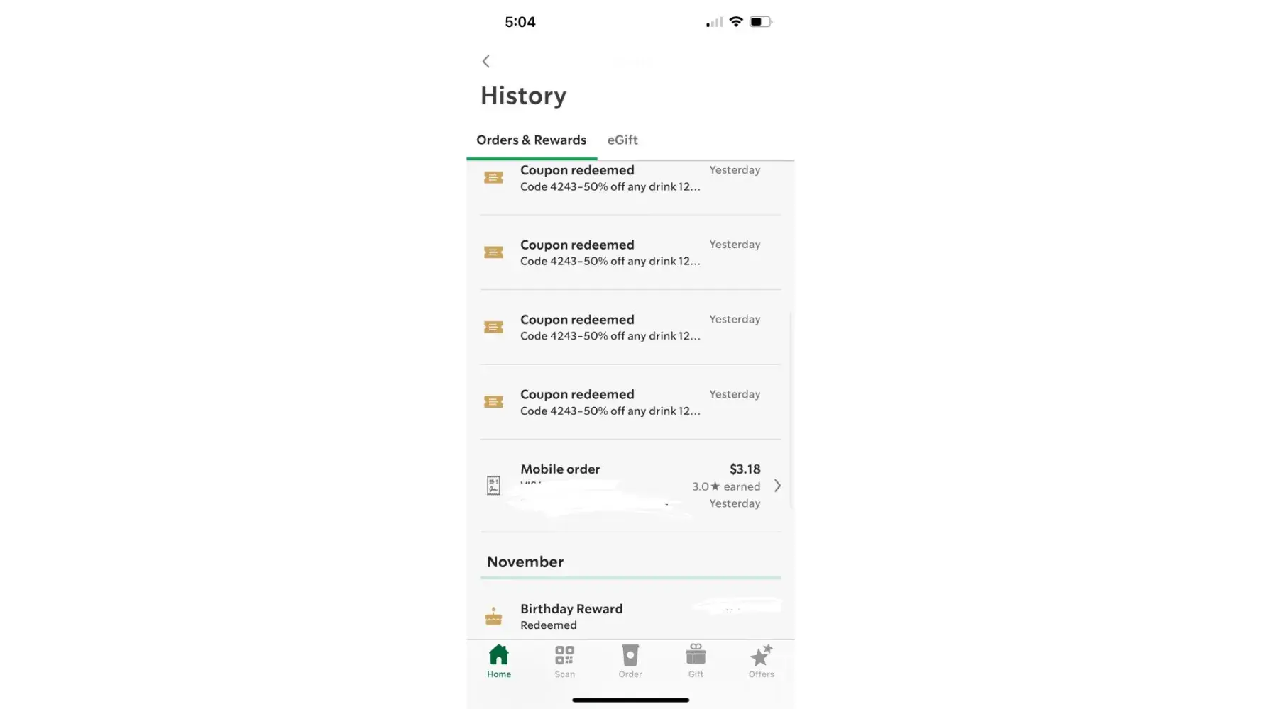 I have a gold card since 2010 and I am always getting a drink from Starbucks. Well both last year and this year I never got my birthday drink. I sent them a email and this morning I received a reply with a mistake my name is Maria and they said dear Kate. They said that I need to purchase a drink before my birthday and I did that the Tuesday and Friday before November 6th ( my birthday) and they hope that I will get my drink next year and also they want my 16-digit number from my gold card to check the number is [protected].