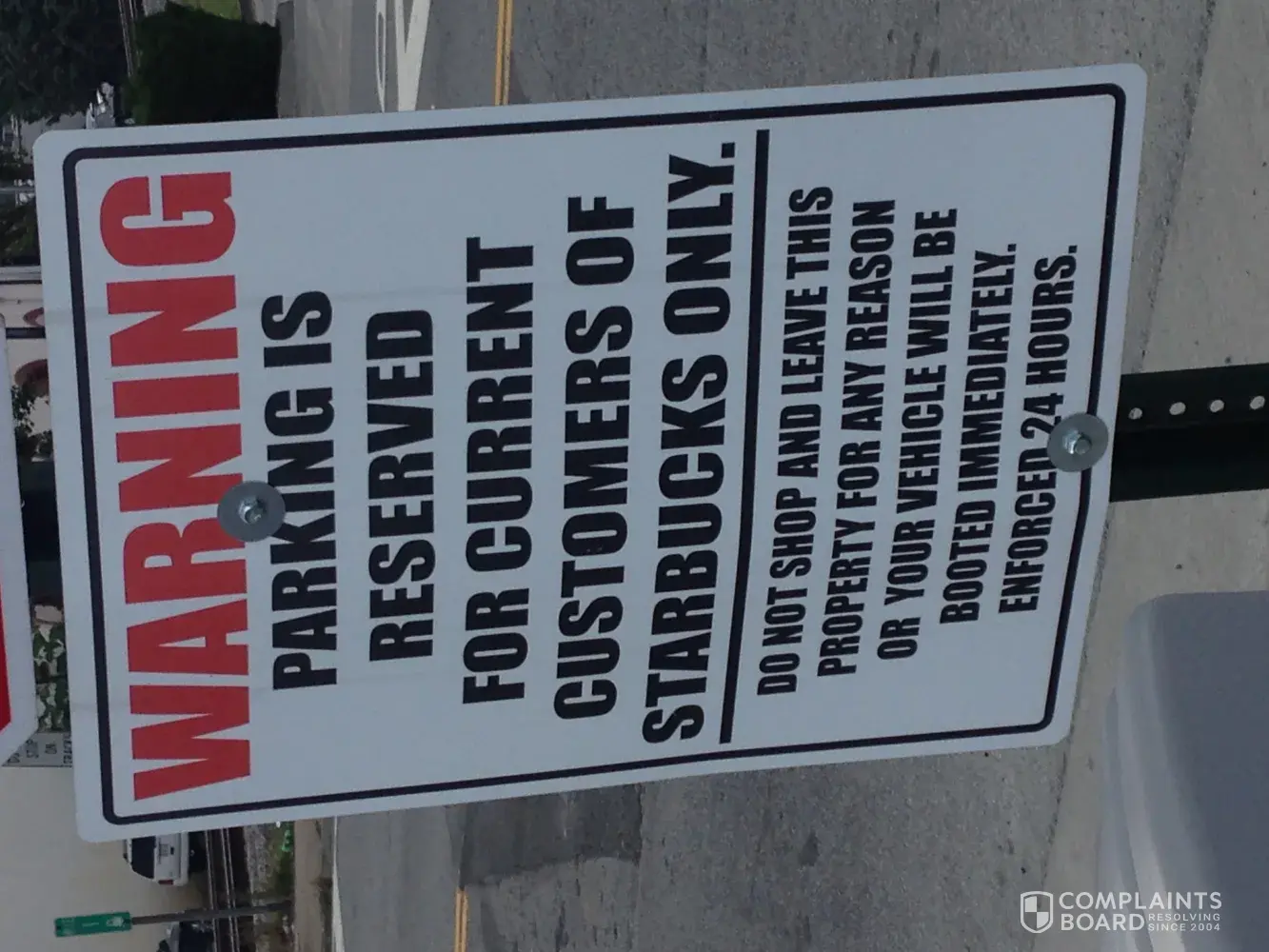 Then he showed me the warning sign. The sign is one under the tree (that some part of the signt is covered by leaves), and the others are at both entrances/exits of parking lot. However, the sign is misleading customers and tricky as in the pictures attached. On top part of the sign is printed in large size letters (warning-parking is reserved for current customers of starbucks only) and the bottom part of the sign in small printed letters saying about booting cars. (the sign in the pic look big because I zoomed it when the picture was taken).