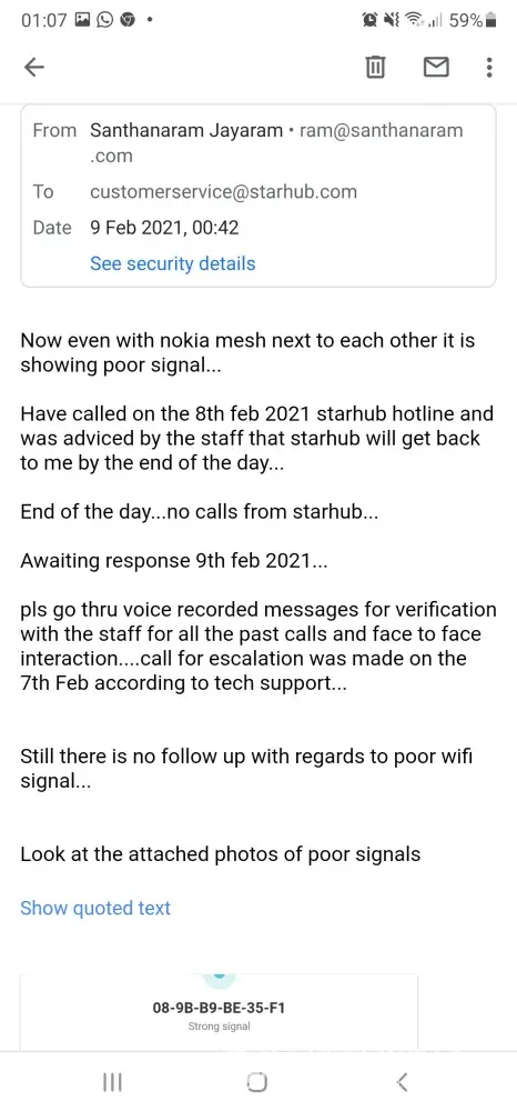 Mr Eapen, I could not understand why a listed company like Starhub would provide such service standards to their customers. I cannot imagine network issues are not given priority by telcos themselves. Furthermore, Sturhub was awarded a few good service awards recently. My wife and I, who had been Starhub customers many years, could not believe the service rendered was so ridiculous. I understand that you had just taken up the role as the CEO and since you are totally new in the company, you may not know about this can of worms which had already existed before you came on board(see feedbacks in Starhub fb page & online feedback on service). I hope you could look into my case to resolve my issue. All I wished for is to install the booster device asap to improve the signals and to receive a fair compensation for me and my wife. Hopefully under your new leadership, things would improve and you could help steer the company to greater heights. Thank you for your time and attention. I am looking forward to your response to the above matter. I can be contactable at [protected]@gmail.com for future correspondences.