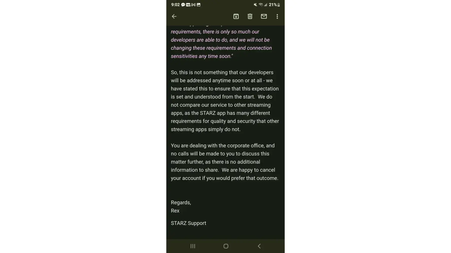 Starz should not even be a company or in business. They don’t care about their customers and they will not resolve any issues they created. They will pass you off and ignore your reasons for contacting them. I have contacted this company over 20 times because they applied my payments to someone’s account that I don’t even know! A starz representative confirmed that there was a big problem and it was on starz end and it would need to be escalated. I received a email in response to this “escalation†that since the account that is not mine had watch history there was nothing they would do and starz considers this case CLOSED. I replied explaining that the payments were applied to a strangerz account with a completely different email no where similar to mine. I then received an email with this response “There is no escalation process for this matter and no supervisor will be able to make contact with you for this reason. We apologize if this is not the information you were expecting to hear or what you might have wanted to hear. However, at this time, this matter is closed, no exceptions will be made based on our Terms of Service, and no further emails regarding this matter will be responded to as there is no further information for STARZ to provide. Regards, Rexâ€.