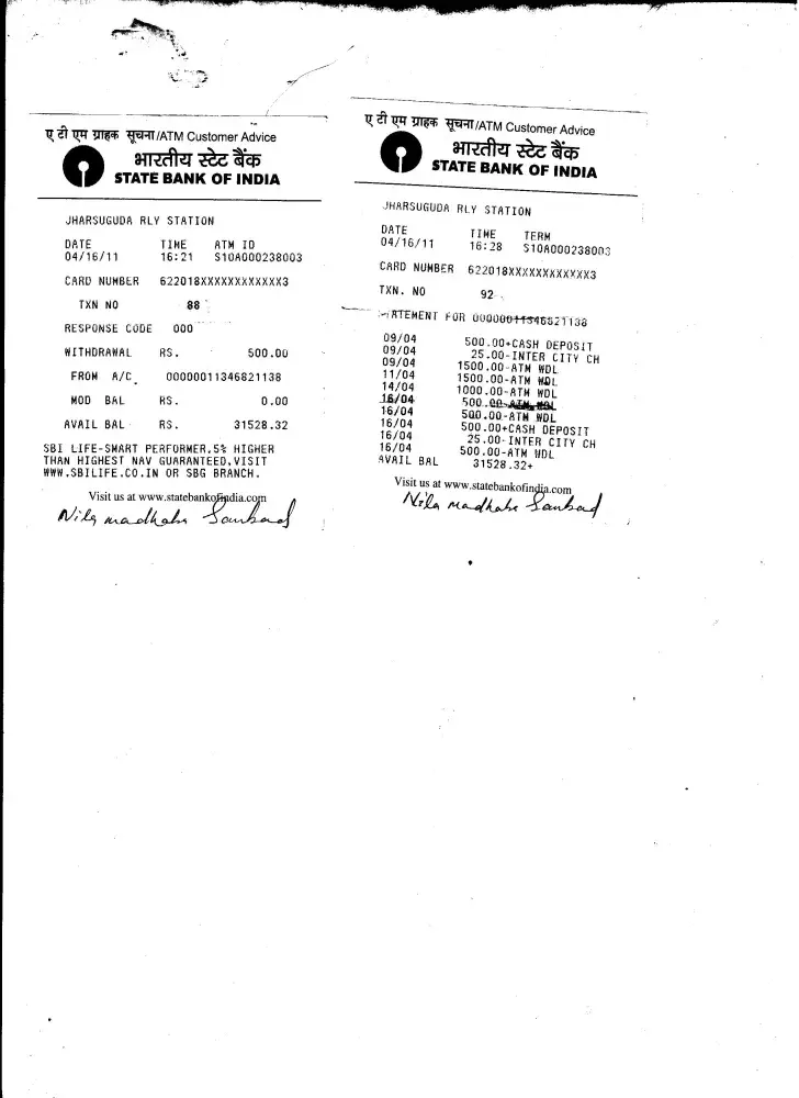On Dt:16.04.2011, I withdrew Rs 500/- from SBI ATM(ATM ID:S10A000238003) TXN NO:88, Jharsuguda, But after i check my ATM it was seen that 2 times it was debited from my account, I had complaint this matter to Customer care but no any measures taken from there side, So i kindly request you to take necessary action please.