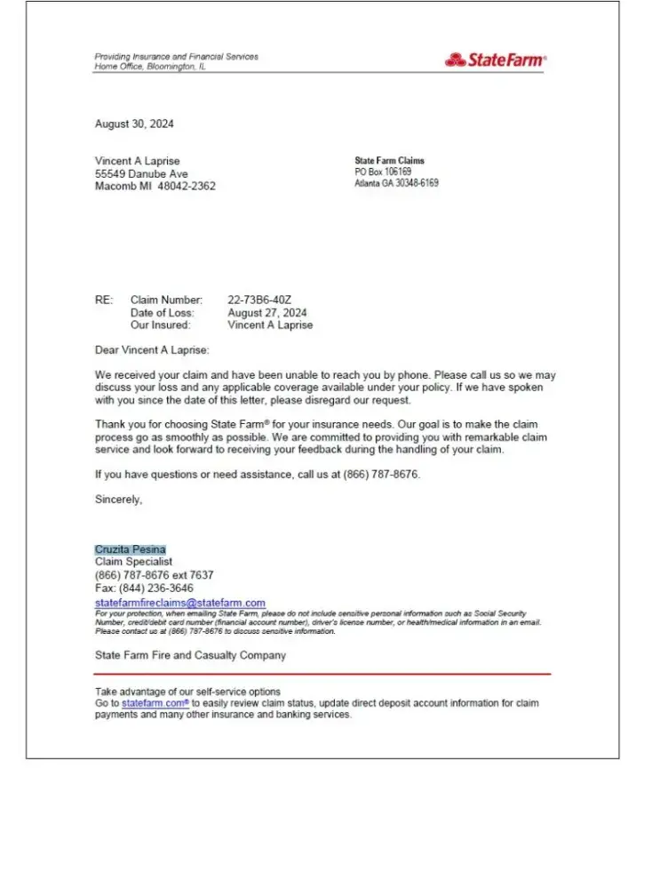 I am currently having difficulty obtaining any information or updates from State Farm regarding my claim (State Farm Claim No: 22-73B6-40Z). On 08/27/2024 lightning struck my home and damaged my roof, alarm system, sauna, and several appliances and devices. The same day, I made an insurance claim and received my claim number from State Farm. The claim ha...