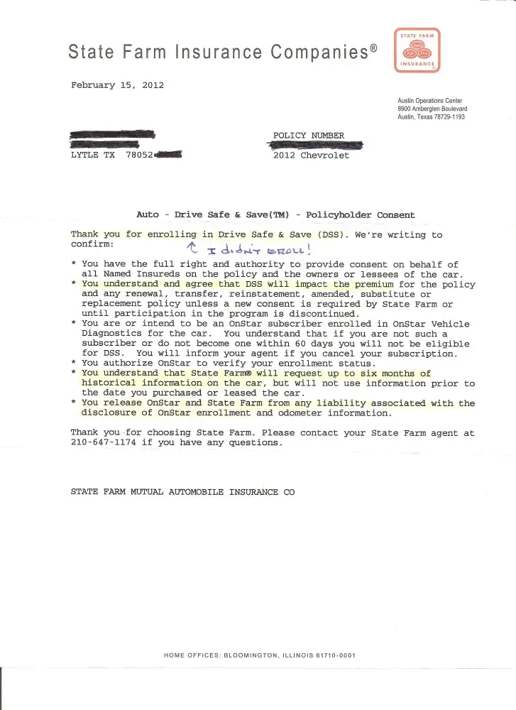 Warning! statefarm sent a letter to me to thank me for enrolling in "drive safe and save" (dss) which is contingent on having active service with on-star. this is statefarm's second attempt to get access to my on-star information and they say clearly that they want the last six month's of my driving history and a release from any liability for on-star's disclosure. the reason this information is so precious to statefarm? they will know exactly how often I exceeded the speed limit, when and where I drive my vehicle, and virtually everything they need to know to justify another increase in my premiums. [protected]@gmail.com