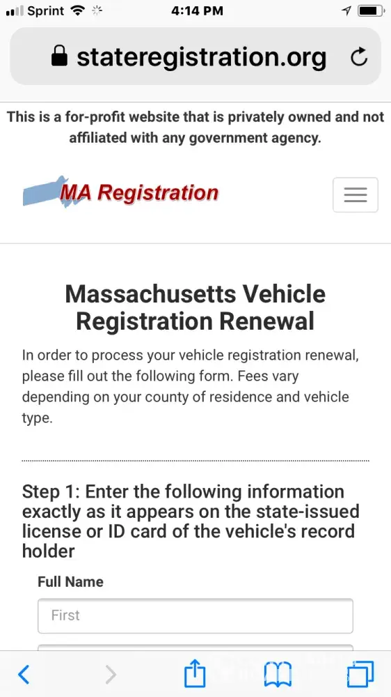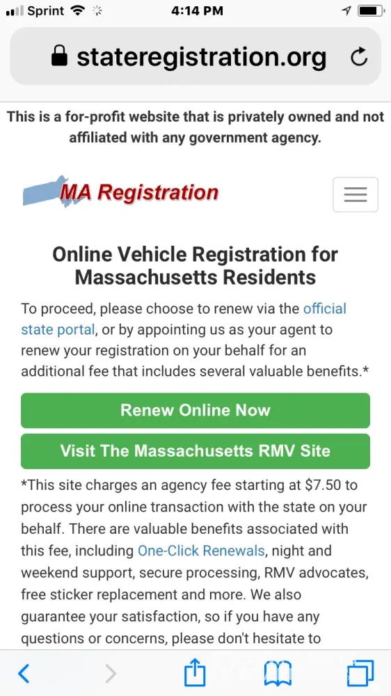 When renew registration RMV is searched on google this site pops up first https://stateregistration.org/massachusetts?gclid=Cj0KCQjwnZXbBRC8ARIsABEYg6D3cknwJHG8tPGmw3FDgWmk0OIvhIqwDNQPFWqLVlqwdDf3Fs6IEaYaAiWGEALw_wcB the 1st icon button says renew reg 2nd says go to RMV website if you are in a hurry you hit button 1. Looks just like RMV site you put in a your license & credit card info and sign up for roadside assistance and they will renew your registration on your behalf. It's legitimate but shouldn't be. It's obvious it's designed to fool someone into thinking they are on RMV Official Site. Small disclaimers on site telling you it's not hard to find so is phone number to cancel. Should be illegal!