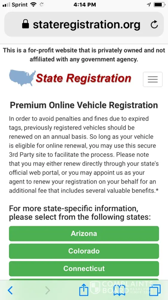 1) There are several bold postings which state the website is a third-party site and outlines their unique services. You are also required to check and sign to confirm you are aware. To counter, my thoughts upon using this service were that StateRegistration.org was the ONLY option for renewing online, in the vein of several companies (our local power company for example) who outsource online payments to services such as WesternUnion, etc. This is not the case. You can use your state DMV website directly to make these payments without the extra charge.