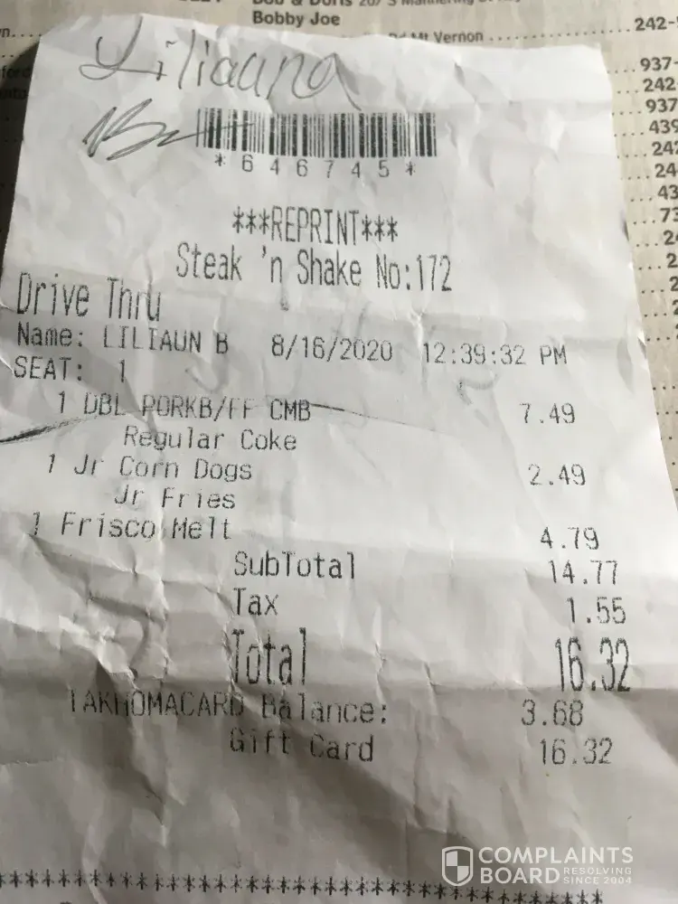 Lastly, on March 8 I received a call from the Steak N Shake complaint line from a young lady who I do not recall her name and she took a report but I have not heard back from her and it's been over two weeks.