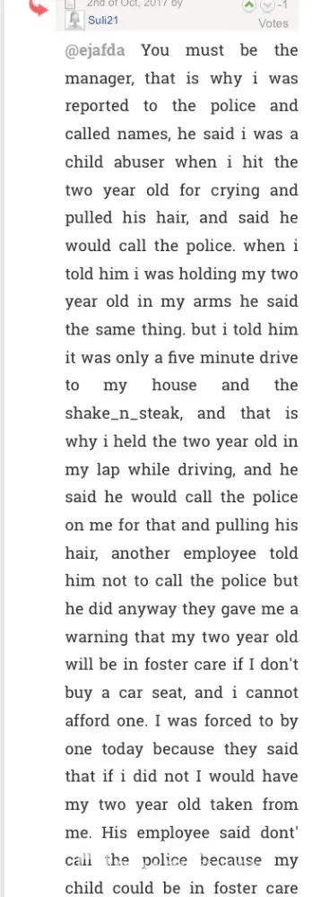 Oh and i lost one of my friends because of this, maybe several more because they took her side. My son really loves the food at Stake-n-Shake, and he was crying when we left.. I was so angry at this point that I slapped him across the face real hard about two times. My "friend" said that I was out of control and called CPS on me. Now because of my "friend" my son could end up in a foster home. The worst thing is my other friends sided with her and said I was abusing my son. Friends don't call CPS on friends.