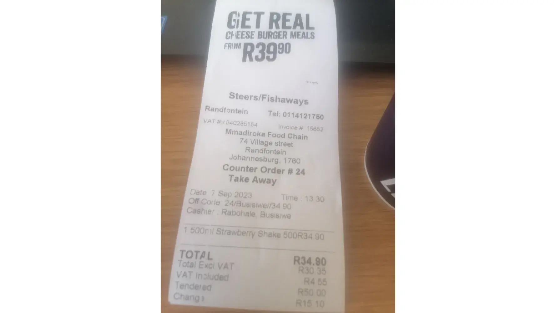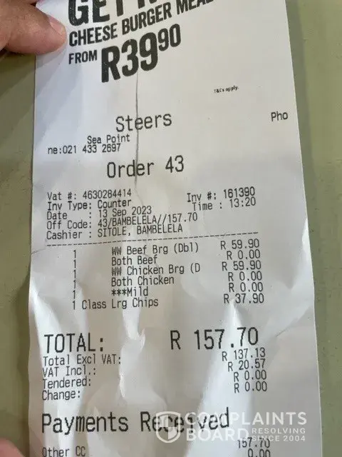 I purchased products to the value of R289.50 at Cape Town International Steers on Sunday @ 11h00.