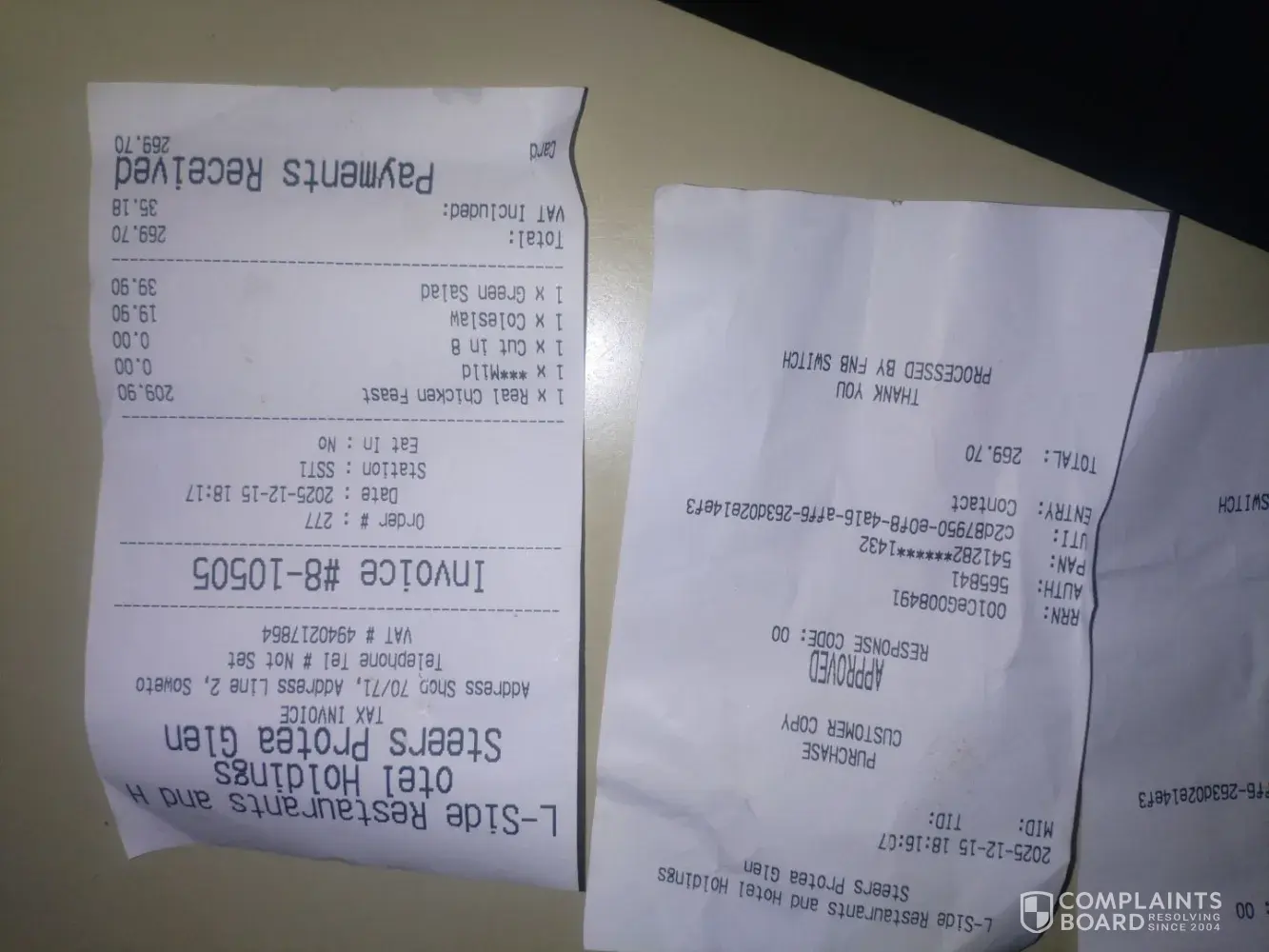 Subject: Formal Complaint Regarding Service at Steers Protea Glen Dear Manager, I am writing to lodge a serious complaint regarding my experience at your Steers Protea Glen outlet on [date, 2025-12-15], where I placed order #8-1056 at 18:17 for a Real Chicken Feast (full chicken, coleslaw, and green salad) with invoice total R269.70. 1. *Excessive...