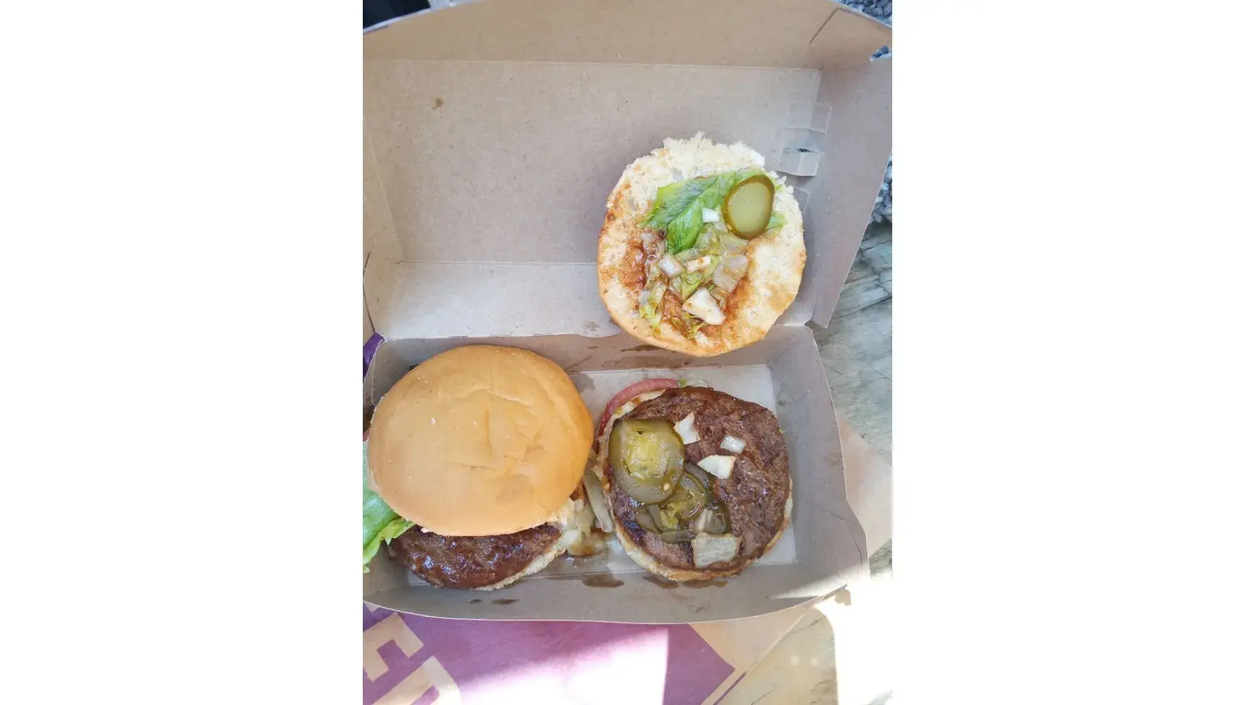 I then realized that my schalk burger meal looked nothing like the picture. on closer inspection I realized that the burger patties were obviously from last night. al flat and cold. tasting of old barbecue fat. thinking back I now realized that the grill had not been fired up yet.