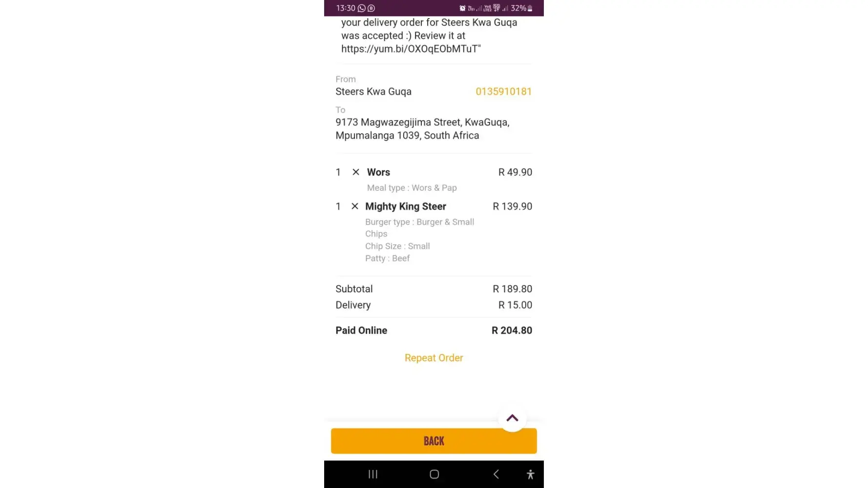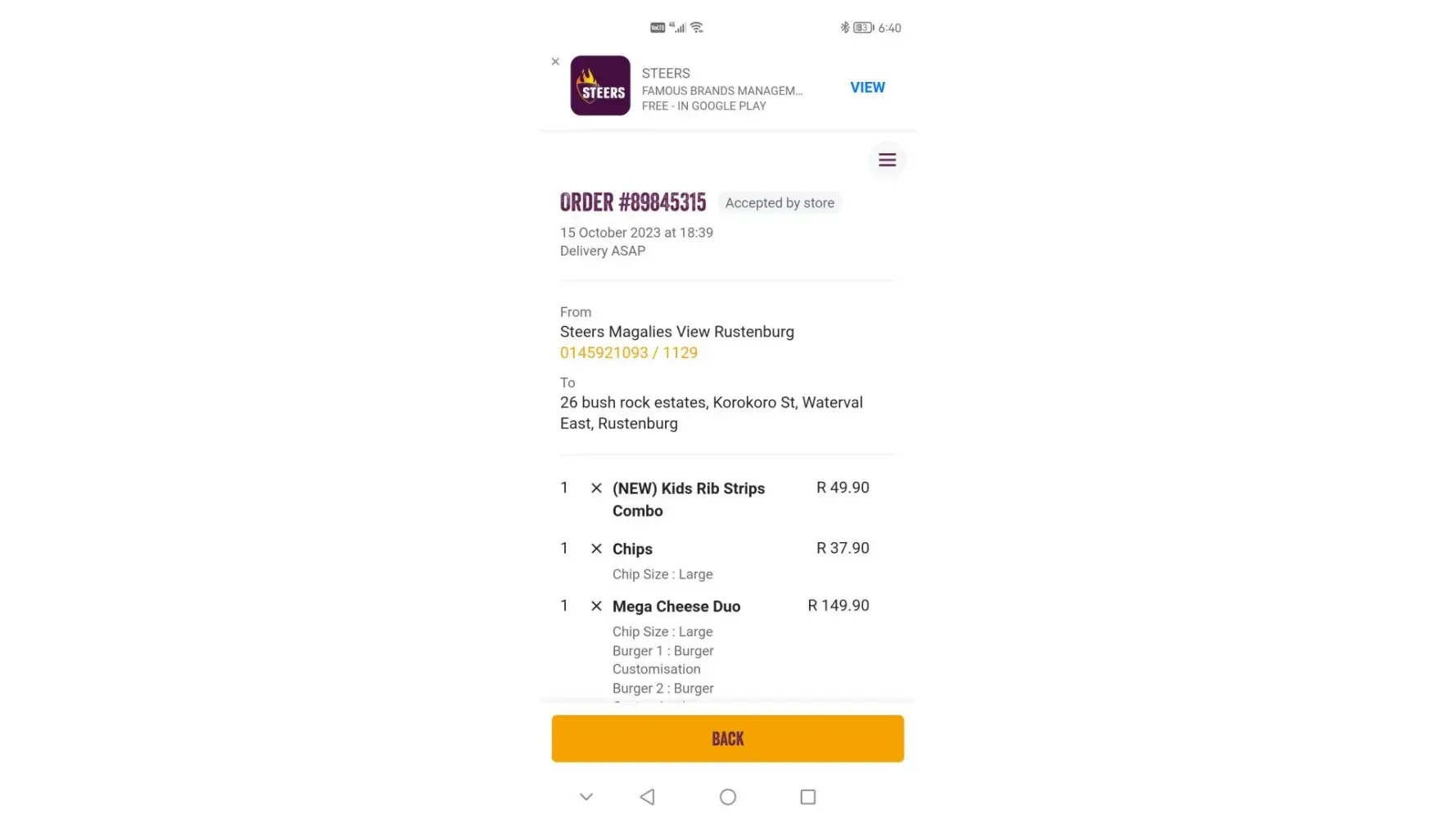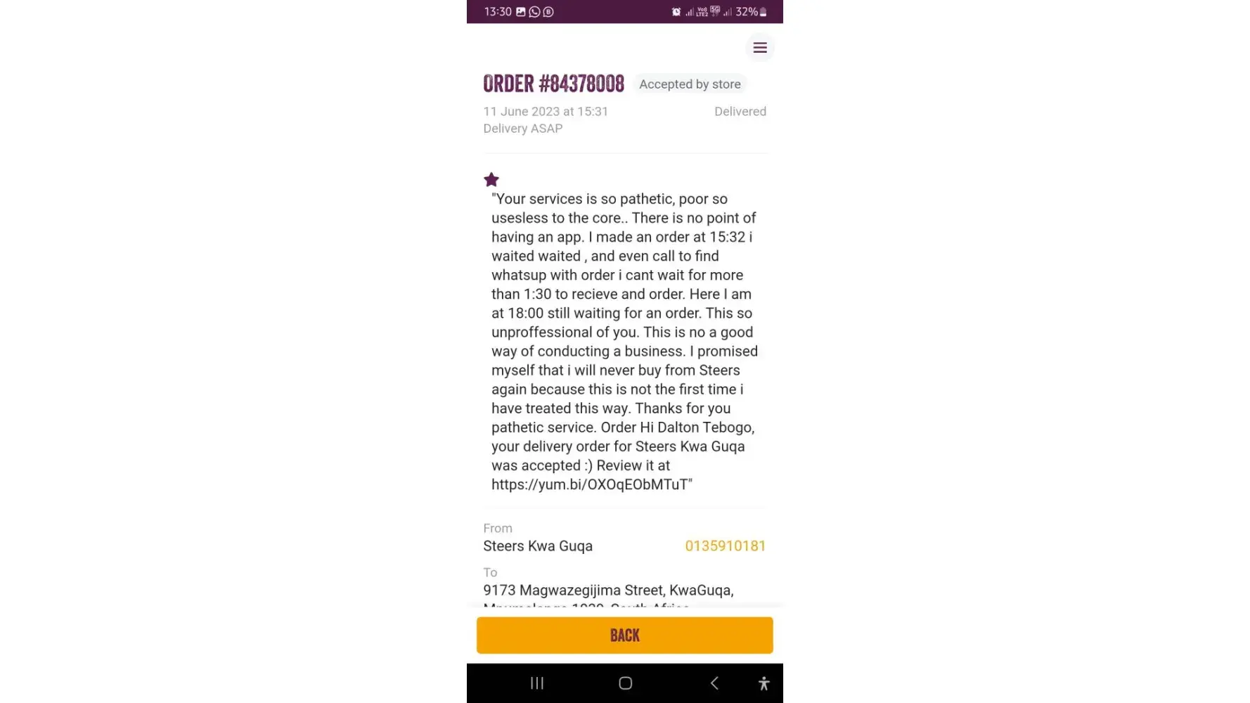 i placed d an order @ around 18:39 pm at rustenburg magalies view.. the order was not delivered its now 9:15 pm. i am so disappointed.. i do have proof.