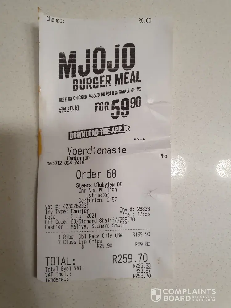 This for me was a first and vow to never use any of the Steers mentioned above as I am rom Johannesburg and never in my life of being a Steers supporter did I ever experience anything like such.