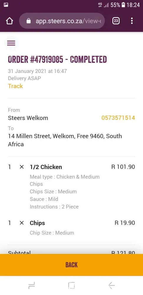 I ordered 3 original king steer this afternoon. I received my order which had a delivery amount which I paid. As the driver came I had to pay delivery again. The chips was hard. The food was cold. I asked to add jalapeno to my burger they added it to the chips who does that? The whole order was not presentable at all. Steers braamfontein johannesburg.