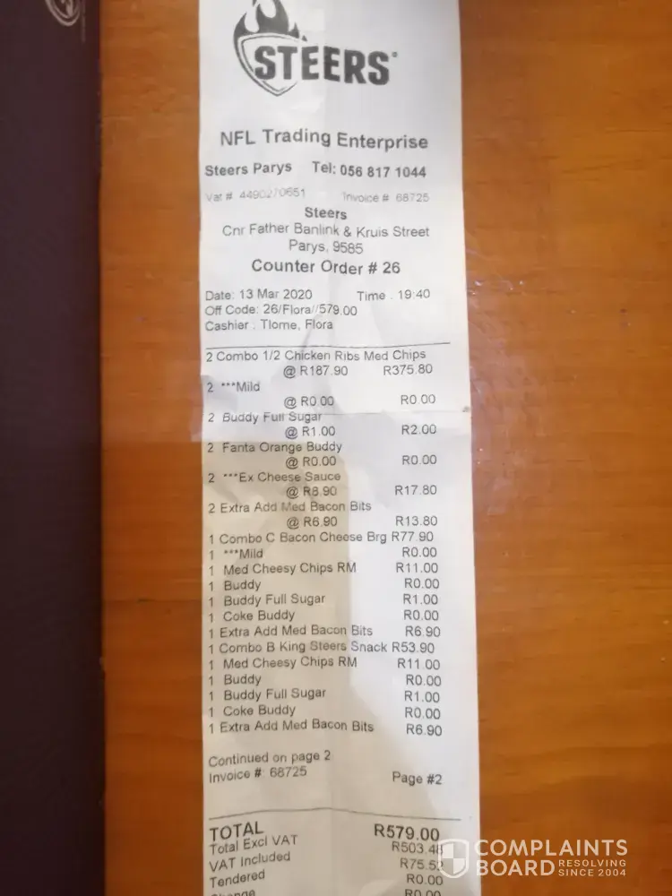 I bought rib and chips today on 21/10/2020 around 12:24 steers Vereeniging.