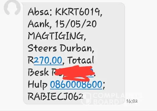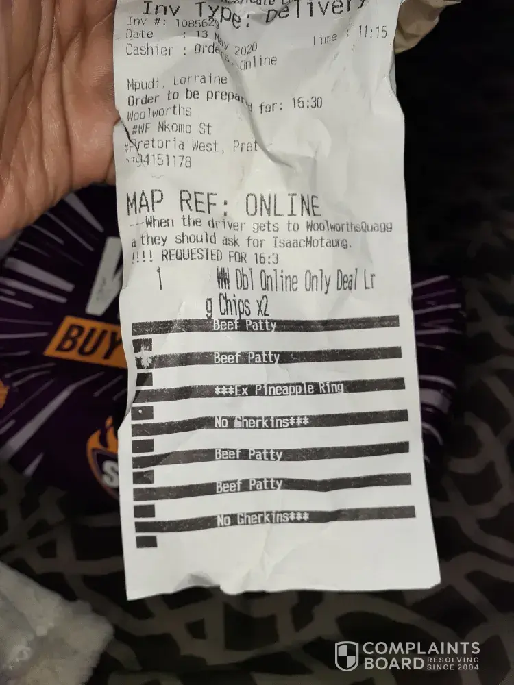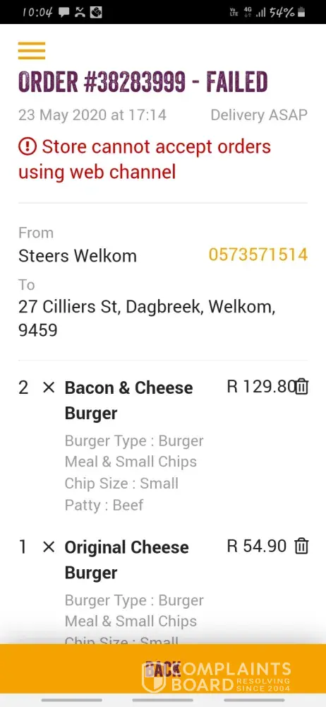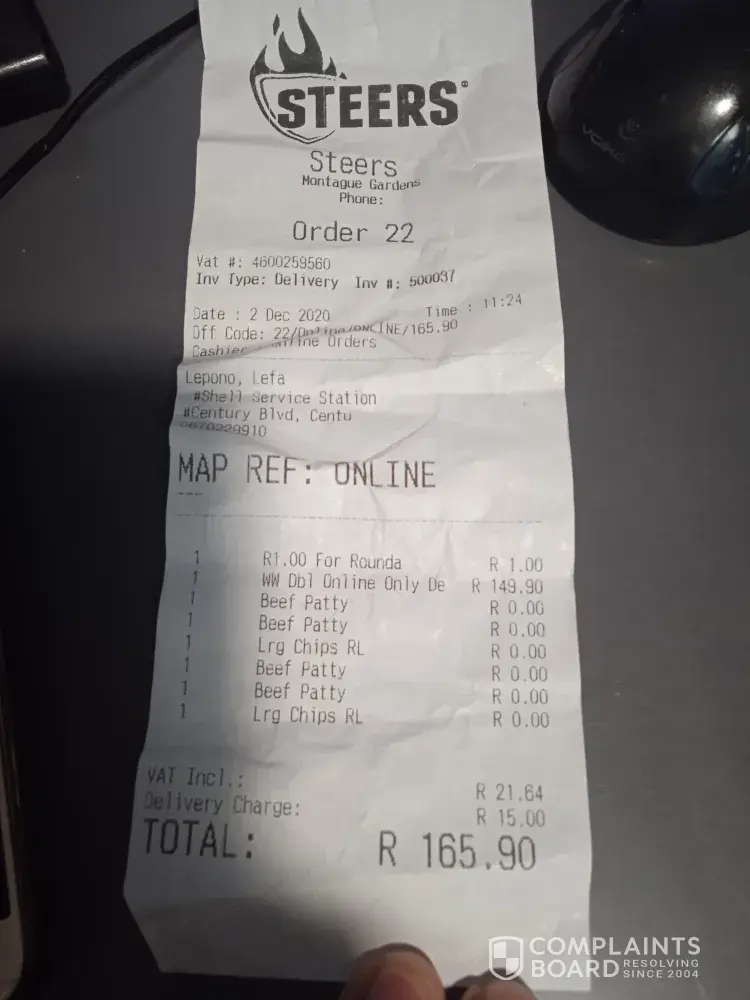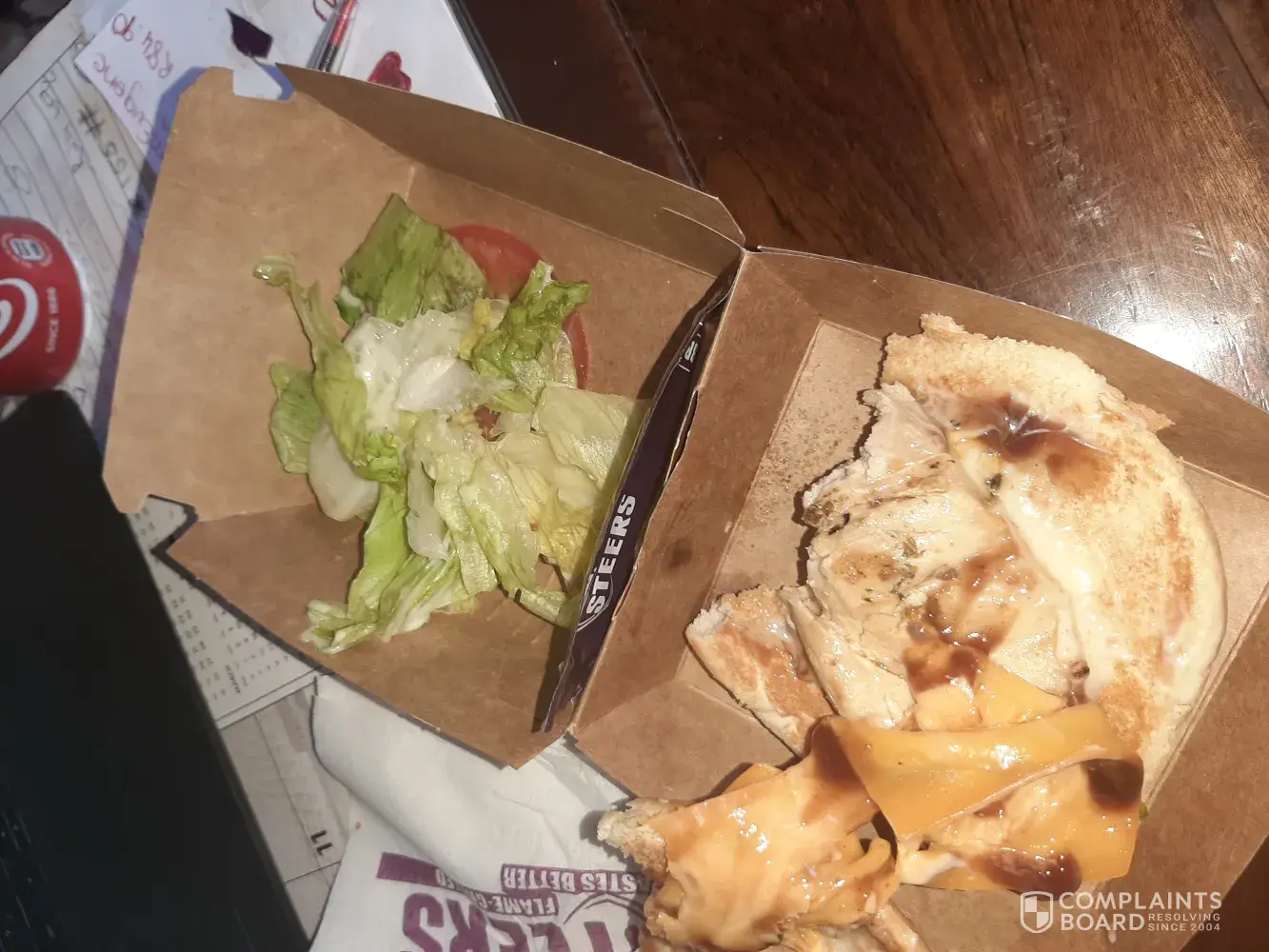 I then sent an email on the same day that I recieved the order and we didn't eat the burgers just incase they would respond and want me to present them with physical evidence. They did not respond, I sent am email on a Wednesday to Steers Philip Nel that was the 13th of May 2020, until today I have not recieved a response and then on the 14th I sent another email to [protected]@steers and they too did not respond today is the 15th and I have not received any feedback from both steers in Philip Nel not even from [protected]@steers.
