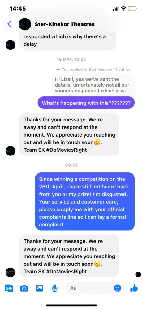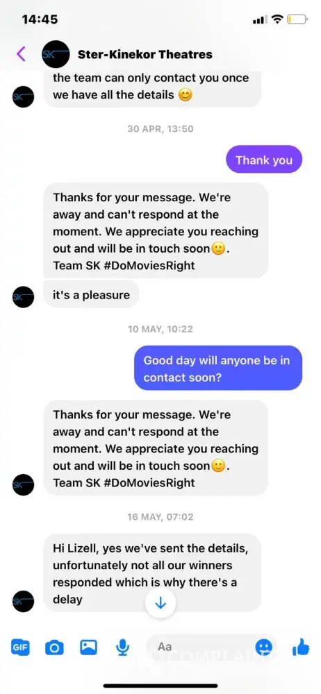 I received a message on the 16th of May via FB Messenger saying that not all winners have replied hence the delay. Since this date, I have not had any feedback despite my constant messaging on all social platforms. I have complained openly on Twitter and their FB pages and no one has taken my complaint or even bothered to reply to me.