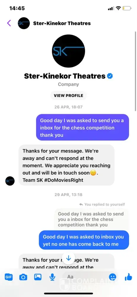 Desired outcome: Id like Ster Kinekor to just confirm what I won and deliver my prize and also to apologise for their poor serivce.