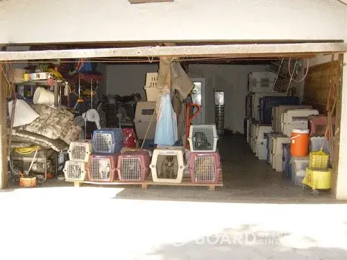 The picture shown above must have been taken something in 2006 or 2007 considering that it was taken at the Lake Elsinore Training Facility, which officially closed it doors as a training facility sometime in late 2008. I was the kennel manager & Senior trainer at the facility from the 1st day the property was purchased sometime in 2005. I originally started working for Steve Welch in 1998. In the picture above you see the garage (connected to the house that that we trainers would live in 24/7) that what was used to house small dogs, puppies & older dogs & dog that were part of the "in kennel training" program or that were in for "house breaking". As it was made very clear to all our training clients, that part of the training does include the use of a crate & crate training. And as part of the training guarantee, it was the owners responsibility to not only learn, but properly use a crate once the dog returned home from training until such time they were told otherwise by their trainer. And since many of you are uneducated, let me explain something to you all. All canines in the natural world nest. Be they members of the wolf family or fox family or even wild or feral dogs. They all nest. And when a canine builds its nest, its just large enough for it to stand & turn inside of, with single hole providing the only way in or out. A dog crate simulates the natural behavior that still exist in all domesticated dog breeds today.