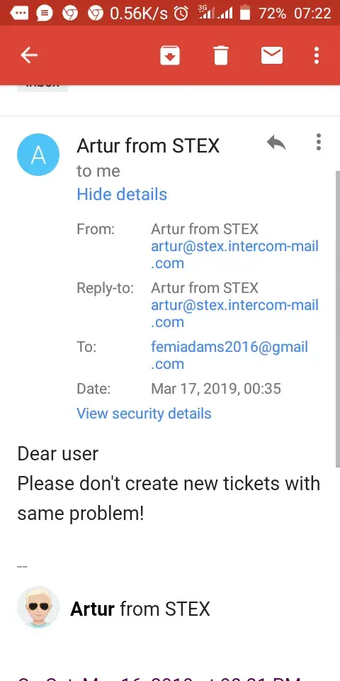 One Artur, an official of stex.com says i should not create another ticket, and there is nothing wrong with their system
