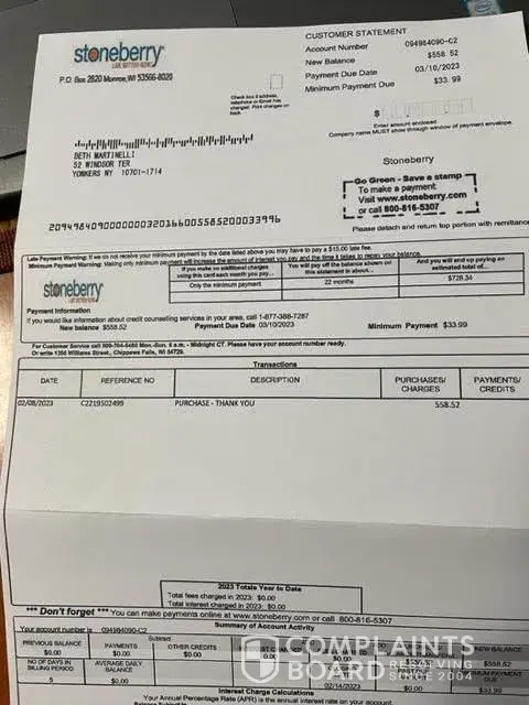 Stoneberry, CS and their fraud dept. were alerted in the late spring/early summer by me concerning a fraudulent account opened up in my name and that possible porch pirates were involved. At that time, I had a pending identity theft police report filed and I was told by Stoneberry that the account would be frozen and terminated. Not only has this not happened, but the company continued billing me up to $1,141.76 that the company is now wrongfully attempting to extort from me by tarnishing my good name, and wickedly referring the matter to a collections agency.
