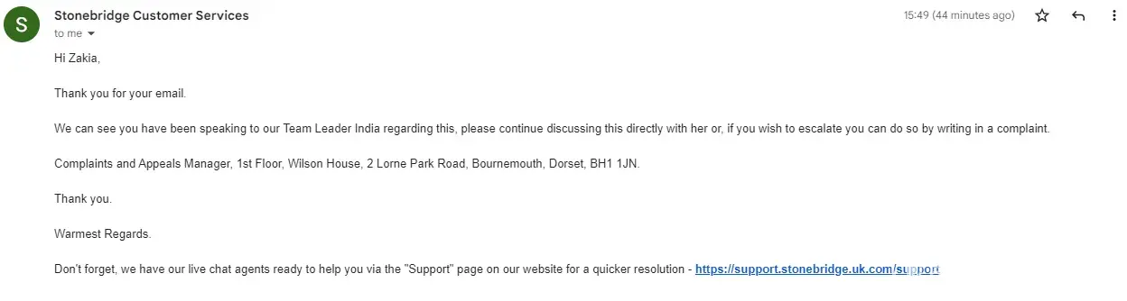 Let me share my story with you. As I am still involved in an ongoing situation with Stonebridge and they are a nightmare to deal with and are extremely good at ignoring any communication with them and will keep transferring your case from one team to another. It appears no one there wants to take any responsibility and thus will keep forwarding your emails from one team to another. So far, I have been in contact with numerous Stonebridge representatives and will not name their last names for data protection reason's, but they include Simon, Tegan, Mark, Julie, Kieran, Nathan, Ian, Sian, Jose, Natalie and Alexandra, Matthew.