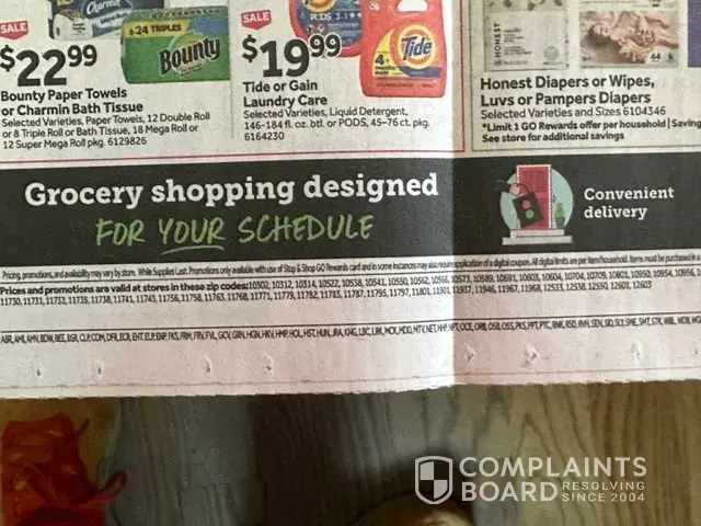 Until today, For the last four weeks or so you have been sending to me in an envelope via US mail the appropriate weekly sales circular for my local store at zip codes 10583, [protected]. Today, I received the circular for other zip codes, similar to the one I receive normally with all my other weekly circulars; these I cannot rely on or use since my local stores in Mamaroneck, Larchmont and White Plains refuse to honor the sales prices shown in those circulars. The managers tell me to go find another store in the appropriate zip code represented in that circular. Why can't you get this corrected permanently? Certainly I am not the only one this stupid mistake affects: it affects everyone who lives in the non-addressed zip codes such as 10583, 10601, 10598, etc.