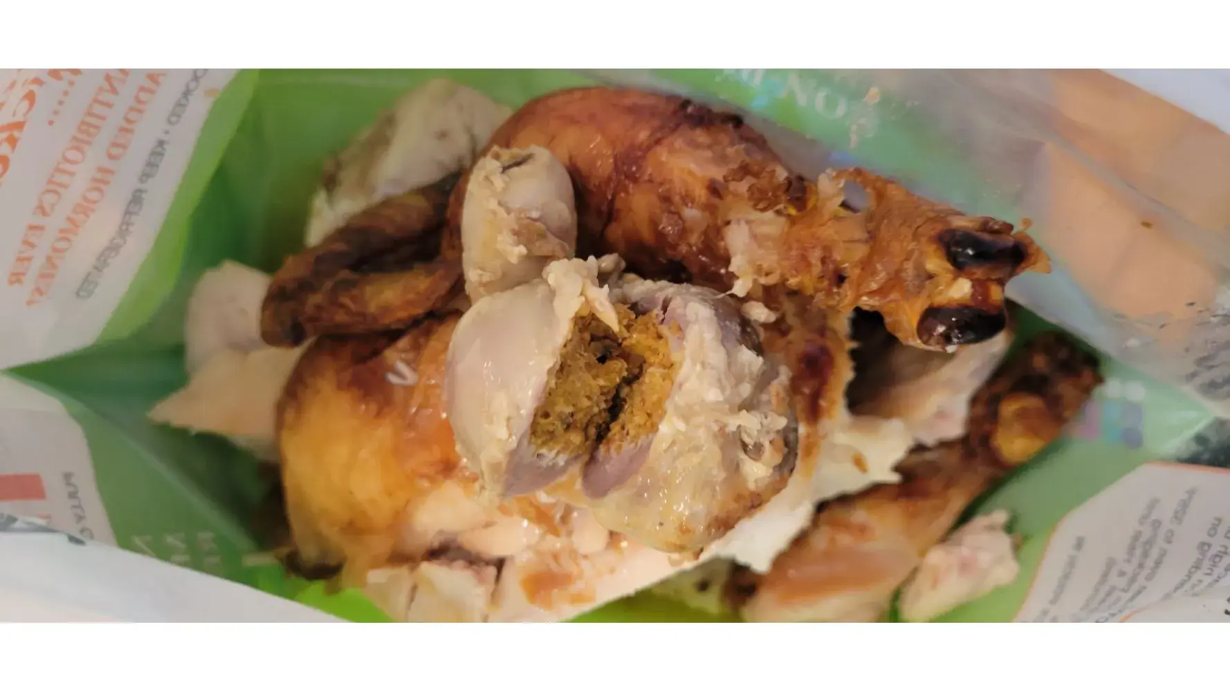Partially through dinner, I discovered a disgusting portion of meat in the cavity of a rotisserie chicken. I do not know what this was or if it was part of a chicken but it was tough and when I cut through it, it looked like a large gizzard full of crap. Please see the picture I brought it back to the store and spoke to your manager Christoper Huss in the...