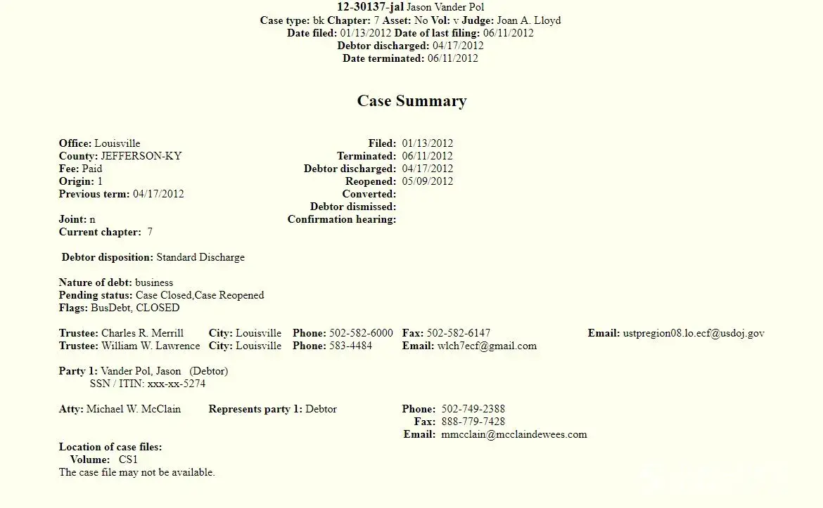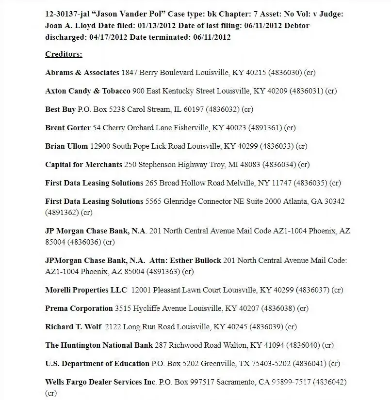 Mr. Vander Pol has no credibility in giving financial advice. He had Bankruptcy Issues that totaled $89, 824.38. This information is PUBLIC COURT RECORD and is unaltered. 12-30137-jal "Jason Vander Pol"​ Case type: bk Chapter: 7 Asset: No Vol: v Judge: Joan A. Lloyd Date filed: 01/13/2012 Date of last filing: 06/11/2012 Debtor discharged: 04/17/2012 Date...