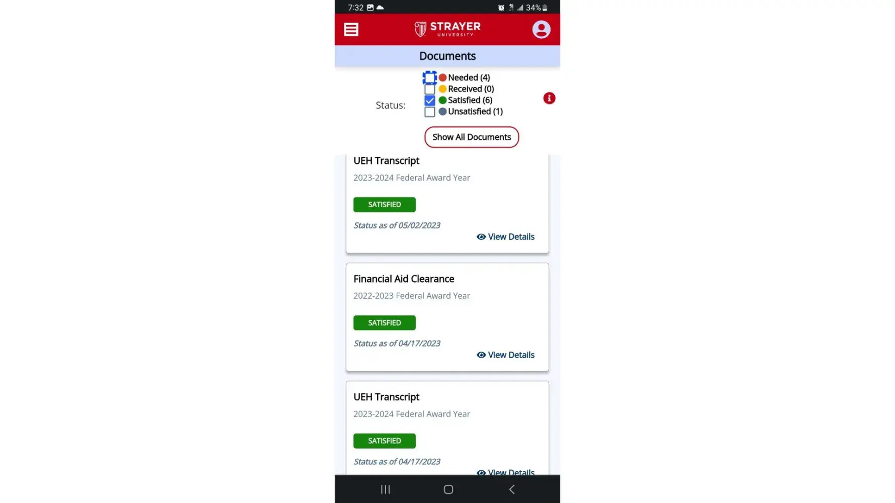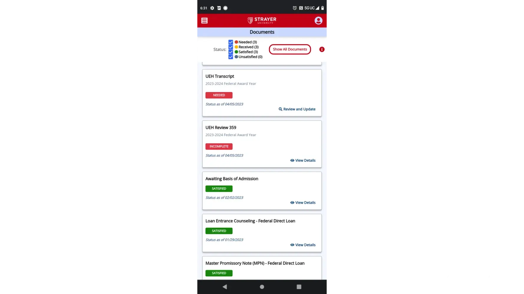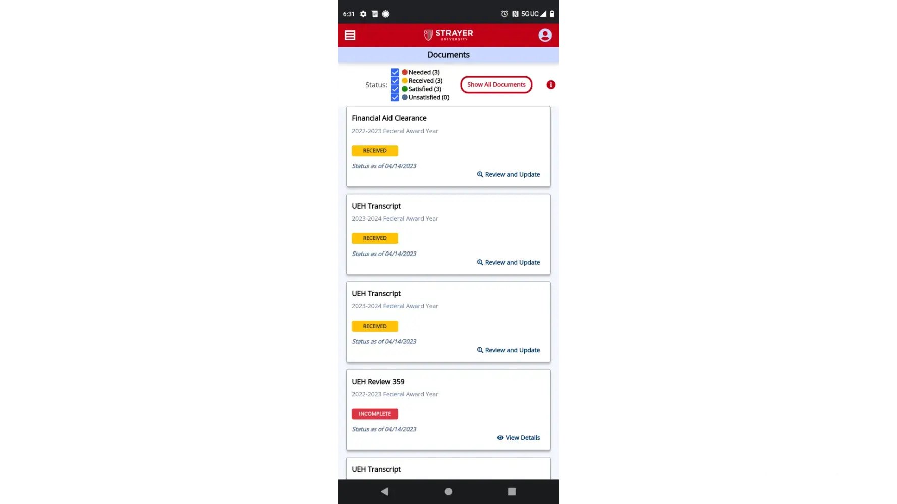 On April 3,2023 I started school at Strayer University. At this point I'm thinking that all my financial aid is taken care of otherwise how can I start? The next thing I know is I'm getting messages saying that I still have awards at a previous school. When I went and got that taken care of they then come out and say that I have UEH. (Unusual enrollment habits). At this point I am just blown away. Supposedly you can't go to two schools within a 3 year award period with loans and two schools in one year with grants. Well neither of these fell under their so called conditions. At first it was because my awards was at another school then it came to be UEH. Here it is midterms and I haven't quit going to school kept an A average through all the torment they put me through and I had to put in paperwork for a review. I put in all documentation that they keep requesting and they keep finding reasons to not disburse my funds. They just sent me an email today saying I only have one more chance to submit paperwork that I have already submitted telling why I didn't have a passing grade at a school I went to back in 2021. These people are crooked ND something needs to be done about them. I still can't understand if I don't have financial aid, how am I in school and they just enrolled me for my next semester. Something is not right and I think something crooked is going on with this school.