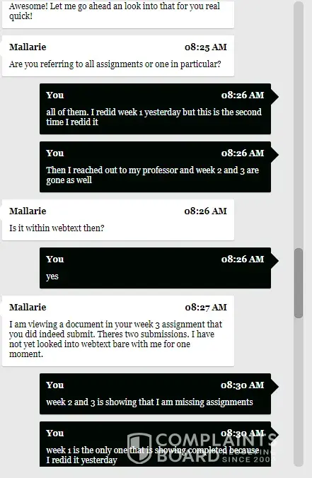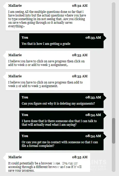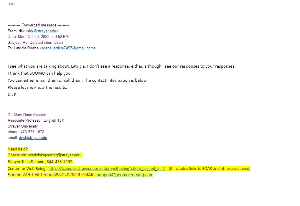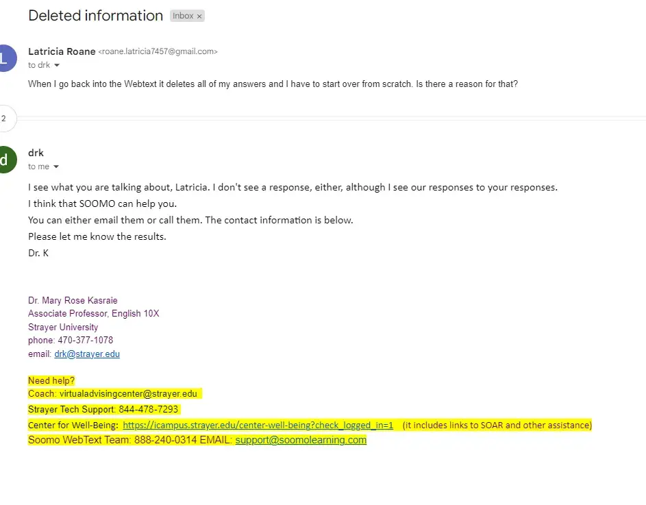 I am an honors student and I have completed my assignments however they have been deleted. I have grades for them, but it is an English assignment which I have no access to any longer. I have reached out to my professor, soomo, wrote multiple tickets, and spoke to their chat option. I am taking four classes and there is no time to have my assignments erased. I have one person telling me to go to someone else to figure out the answers and I have another person saying that it deleted because of my web browser. My assignments are getting turned in and graded how am I no longer able to see my assignments afterwards? This is crazy that I have to go through so many options when the system that Strayer is using is making a mistake.