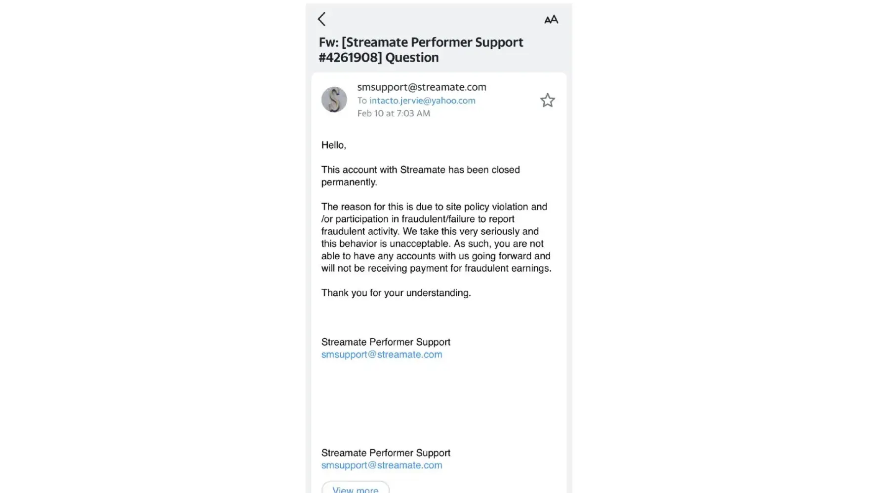 Me and my husband we both are working as a model in streamate from last few months but they terminated my account recently by claiming that it was closed due to fraudulent activity.