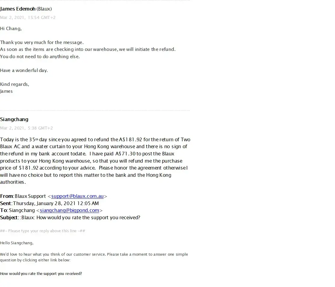 2 March 2021 (35th day)-Contacted Blaux and told them I have not received the refund
